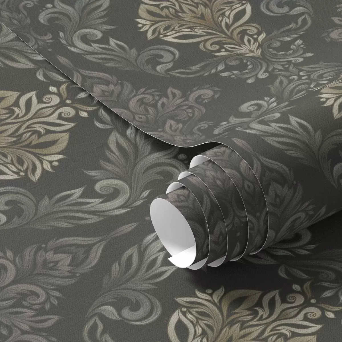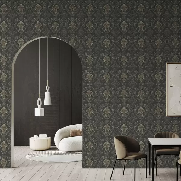 Ταπετσαρία Δαμασκηνό σε σκούρο γραφίτη φόντο, με πινελιές σε χρώμα ελιάς-ώχρας Nr. a00828v5