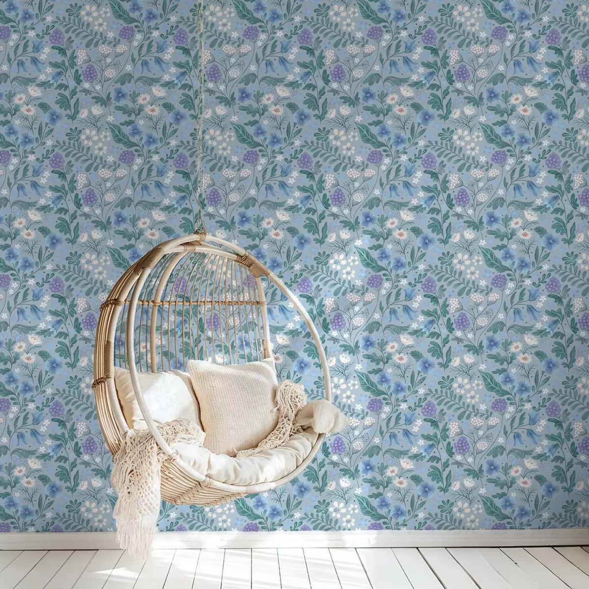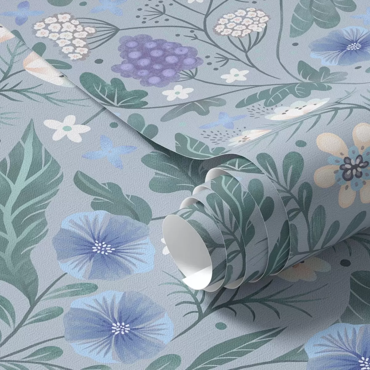 Ταπετσαρία Άγρια λουλούδια και μούρα σε γκρι-μπλε φόντο Nr. a00849v1