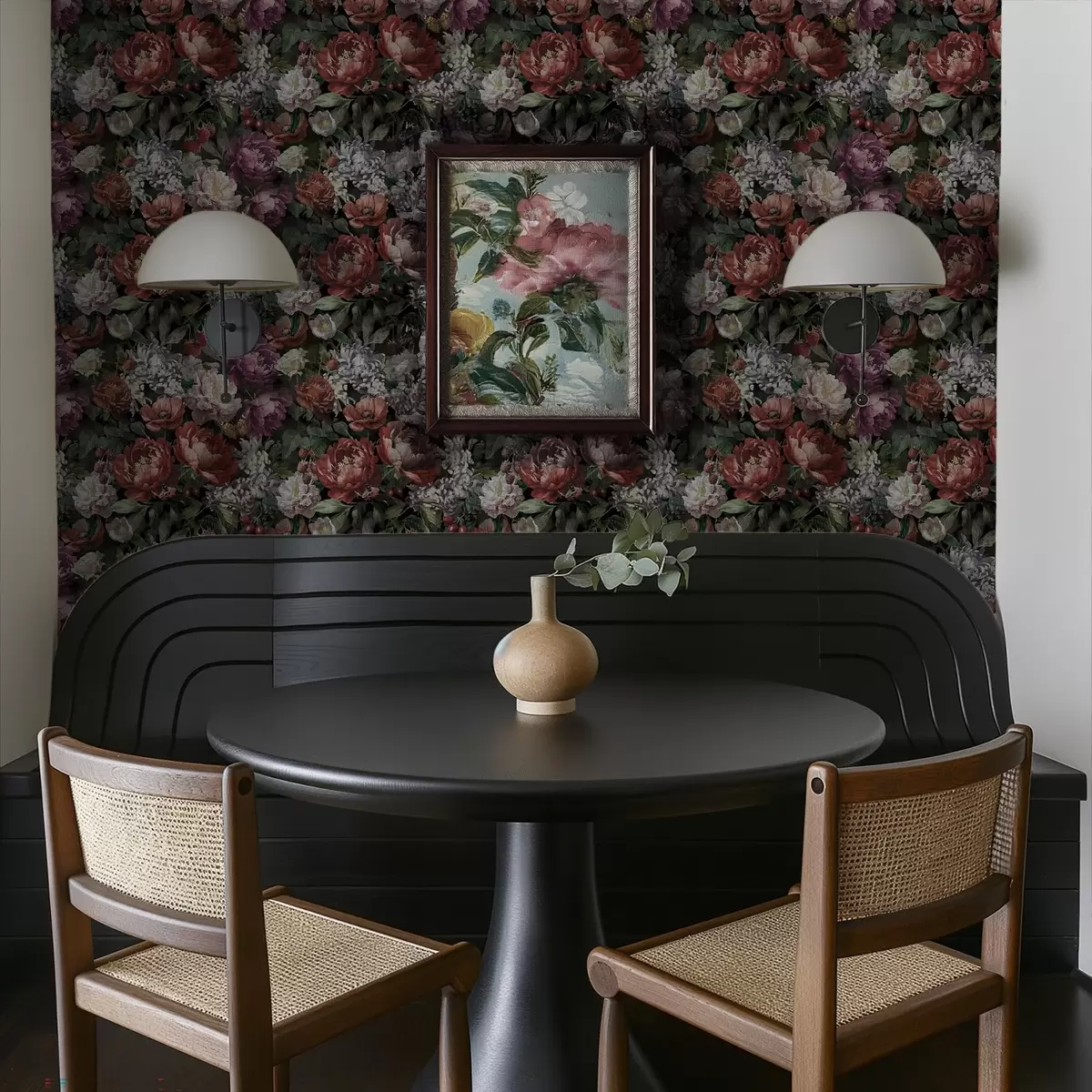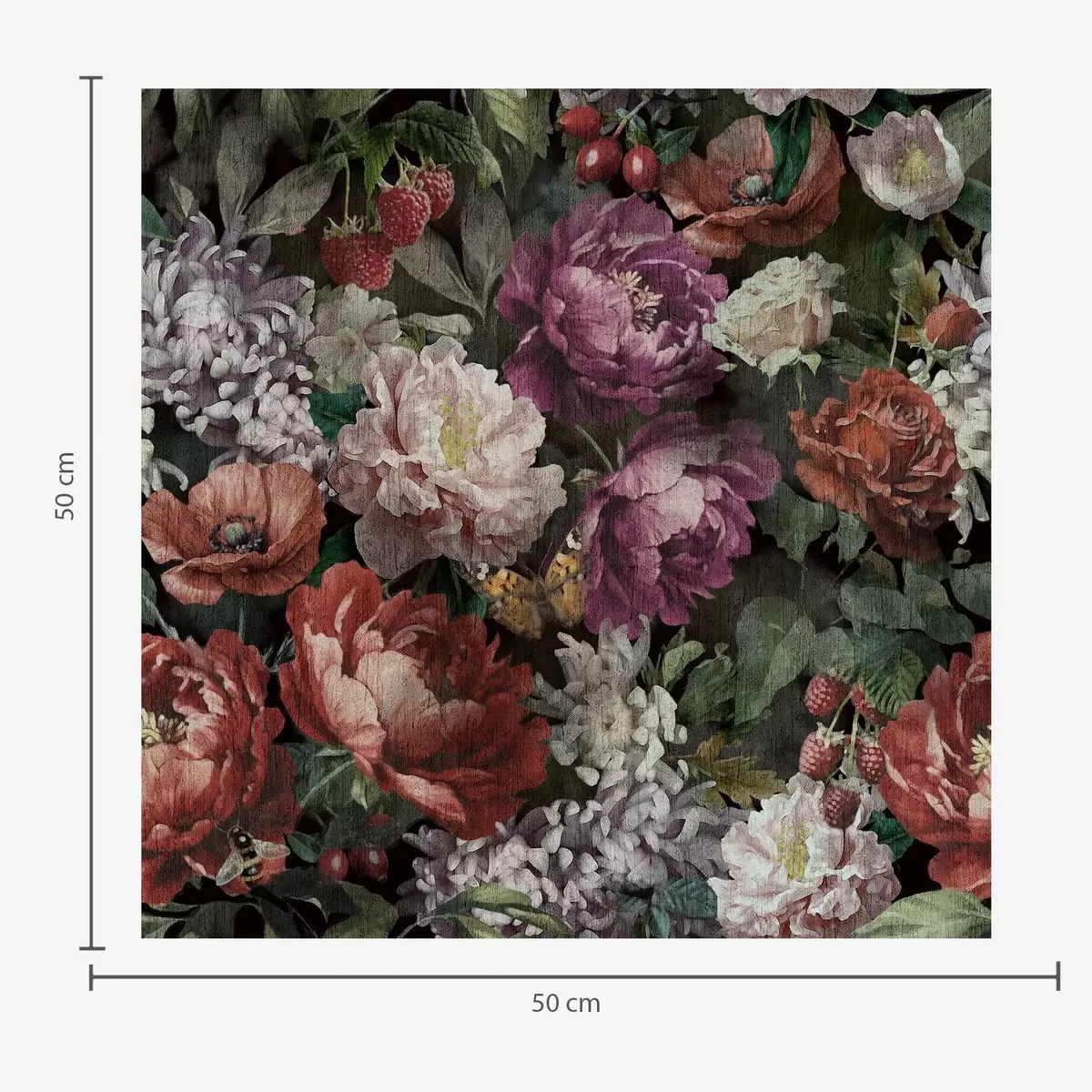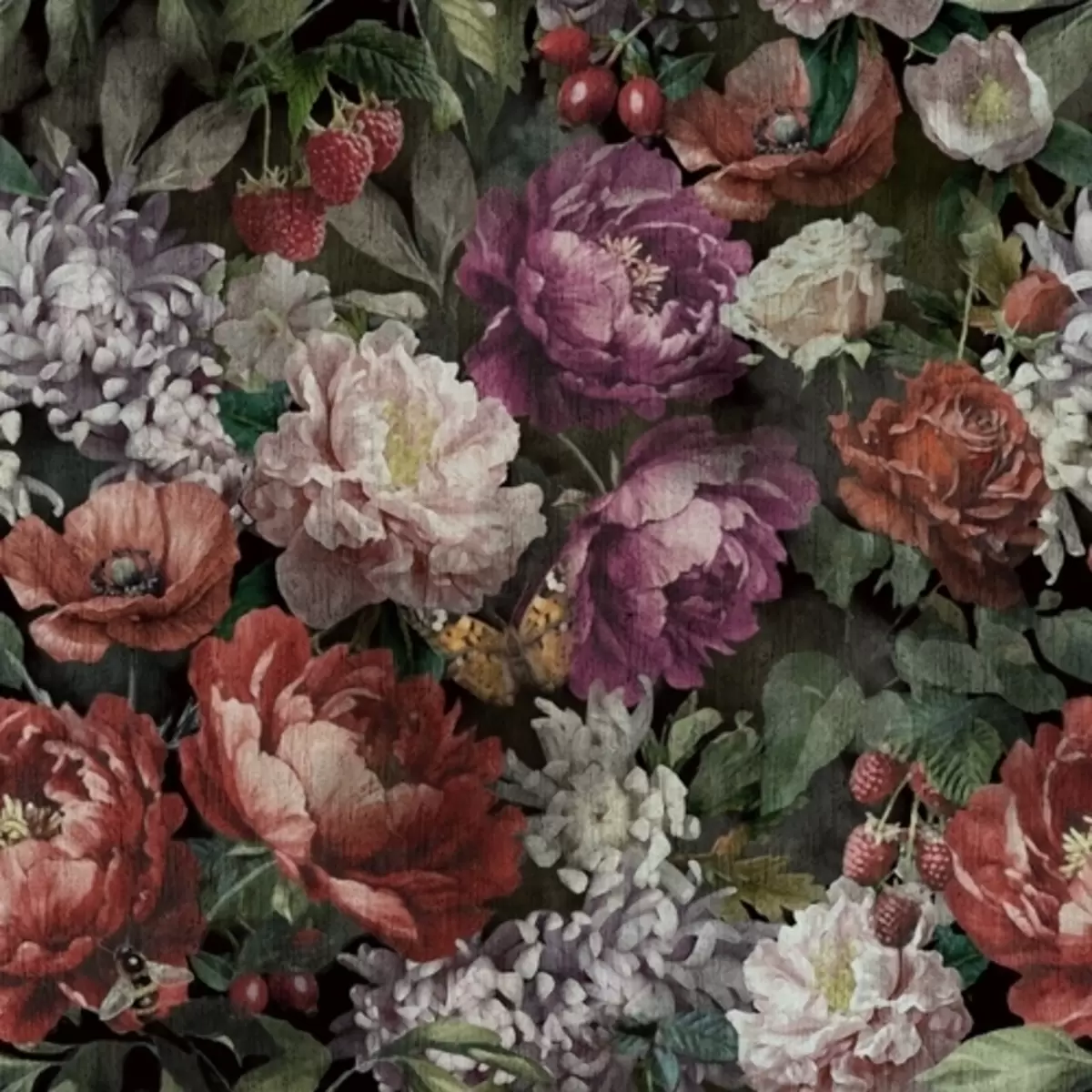 Τοιχογραφίες Σκούρες δραματικές παιώνιες, μούρα και πεταλούδα σε μαύρο φόντο Nr. a00862