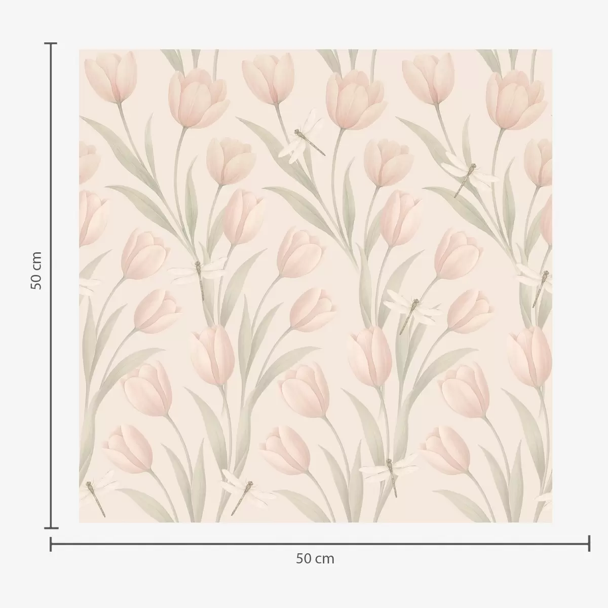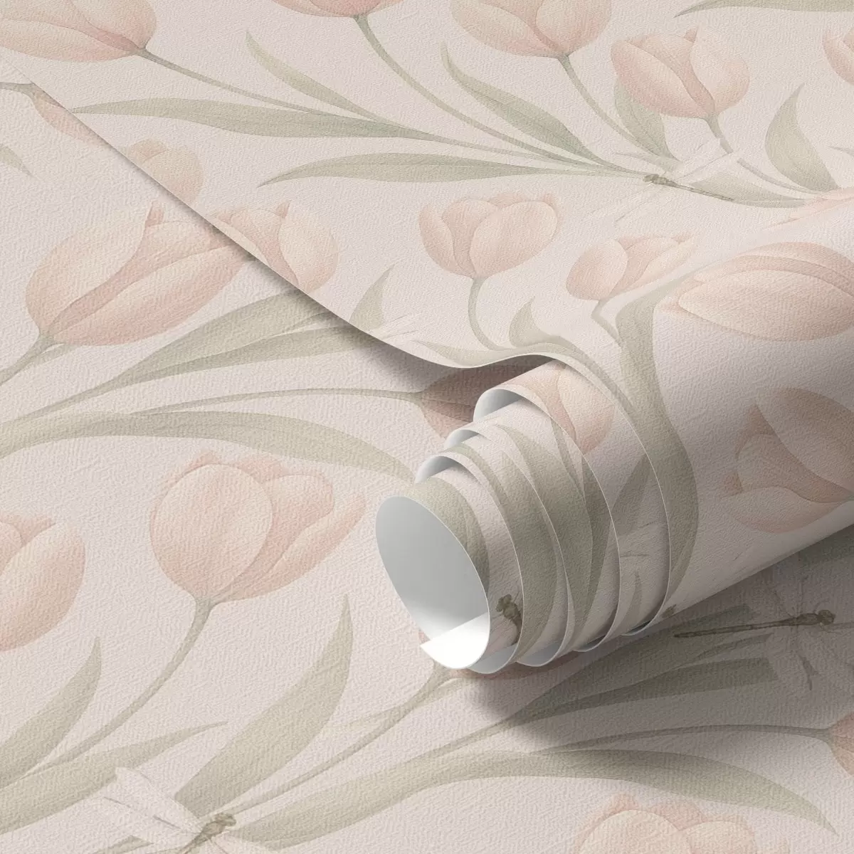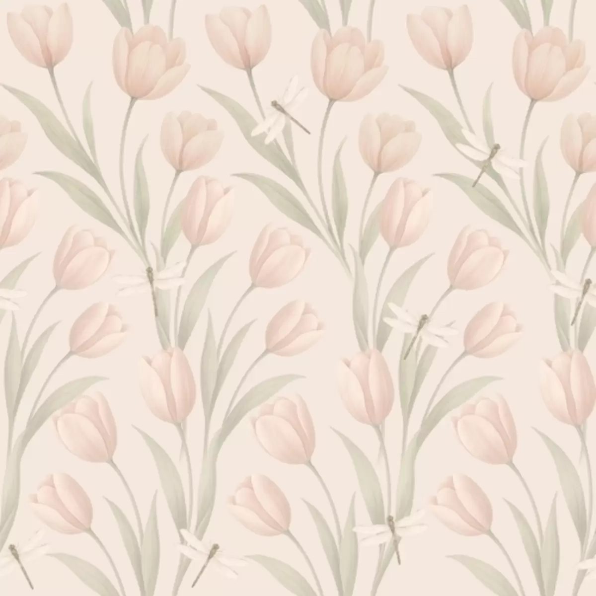 Τοιχογραφίες Παστέλ τουλίπες με λιβελλούλες σε ροζ φόντο Nr. a00876