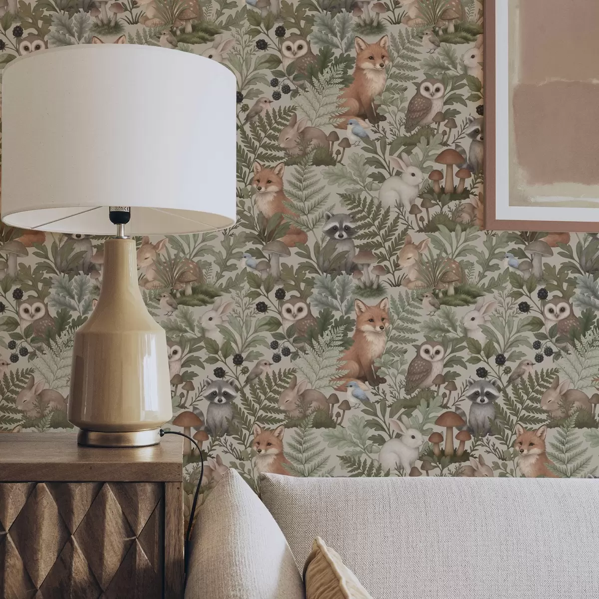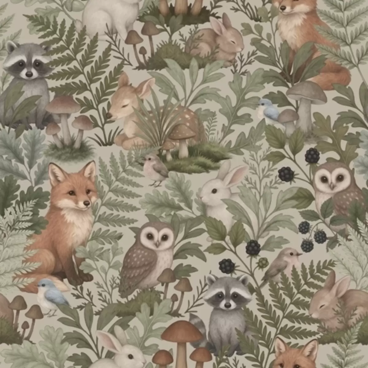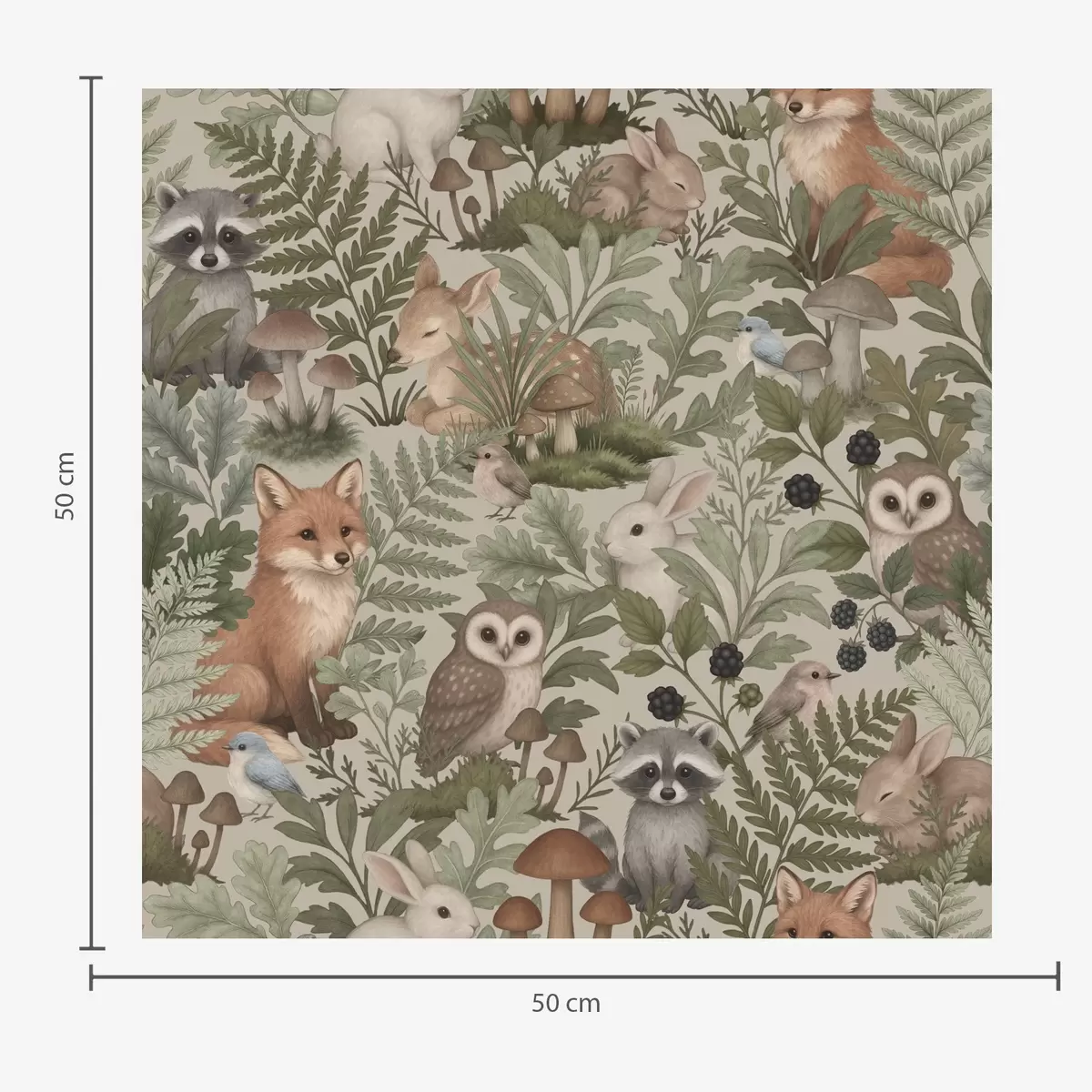 Τοιχογραφίες Ζώα του δάσους, φτέρες και μανιτάρια σε ανοιχτό μπεζ χρώμα Nr. a00880v1