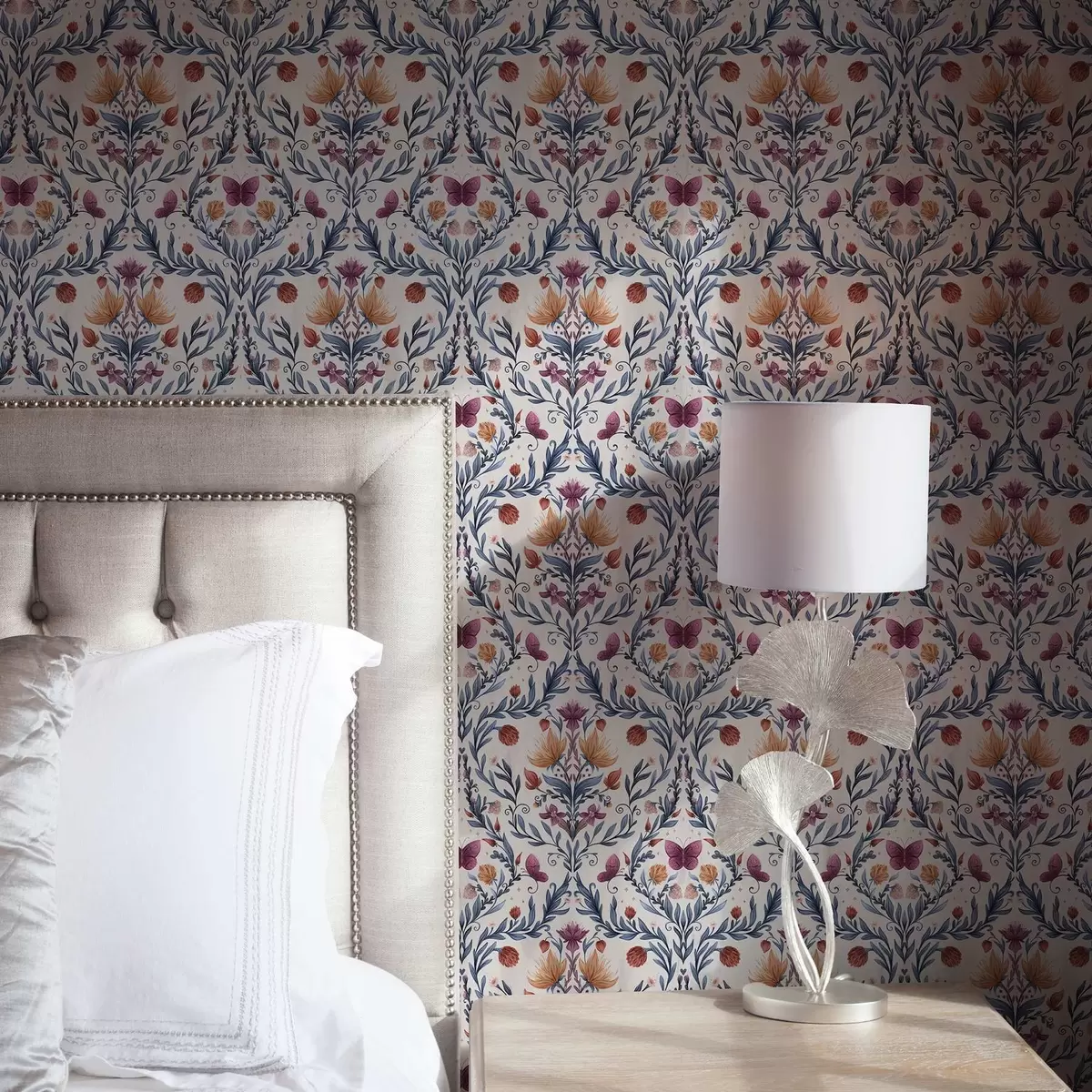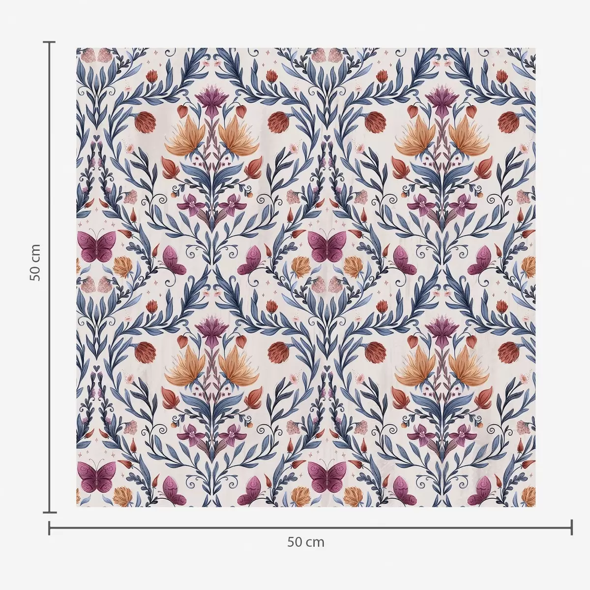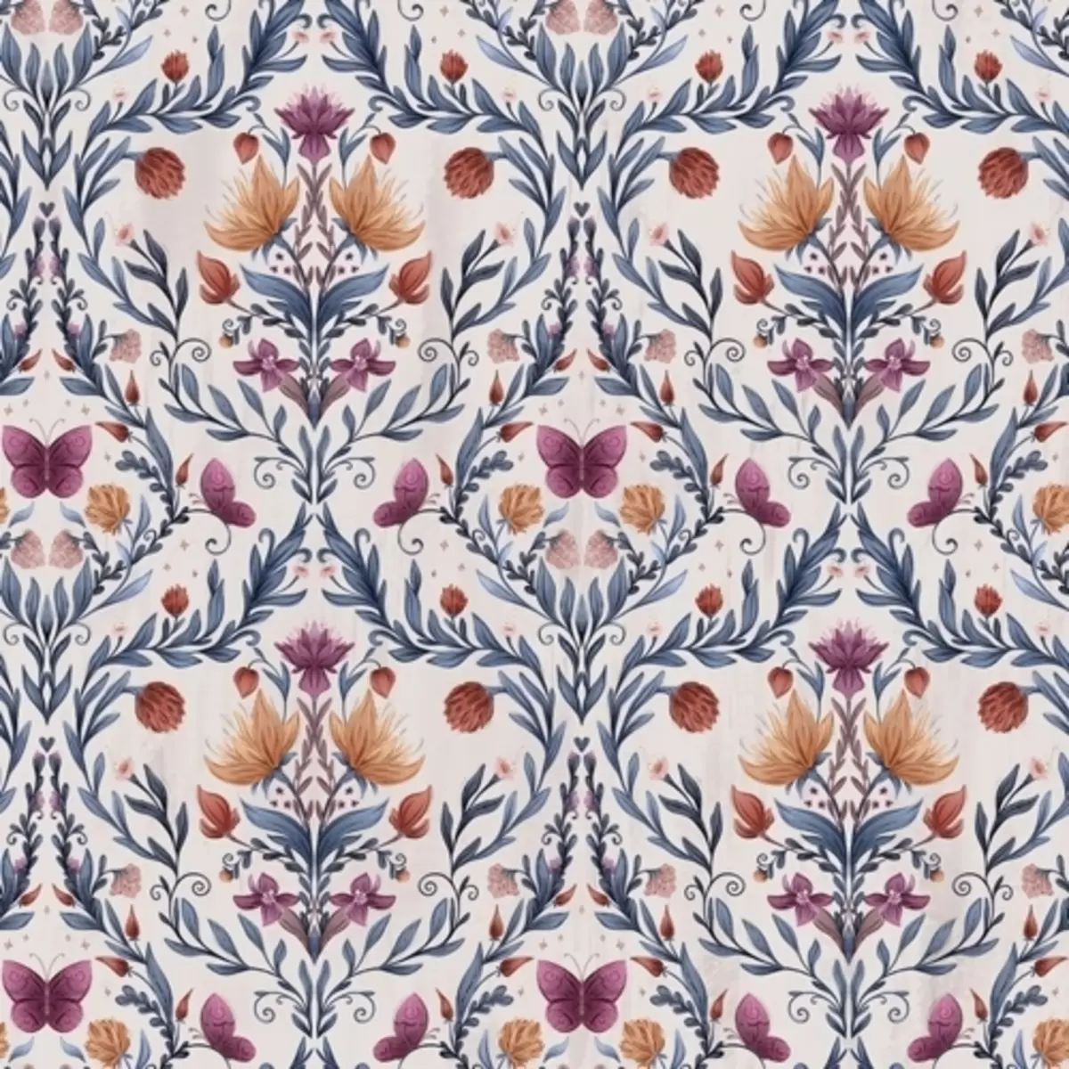 Τοιχογραφίες Λουλουδάτο δαμασκηνό με πεταλούδες σε μπλε και τερακότα χρώμα πάνω σε λευκό φόντο Nr. a00926v1