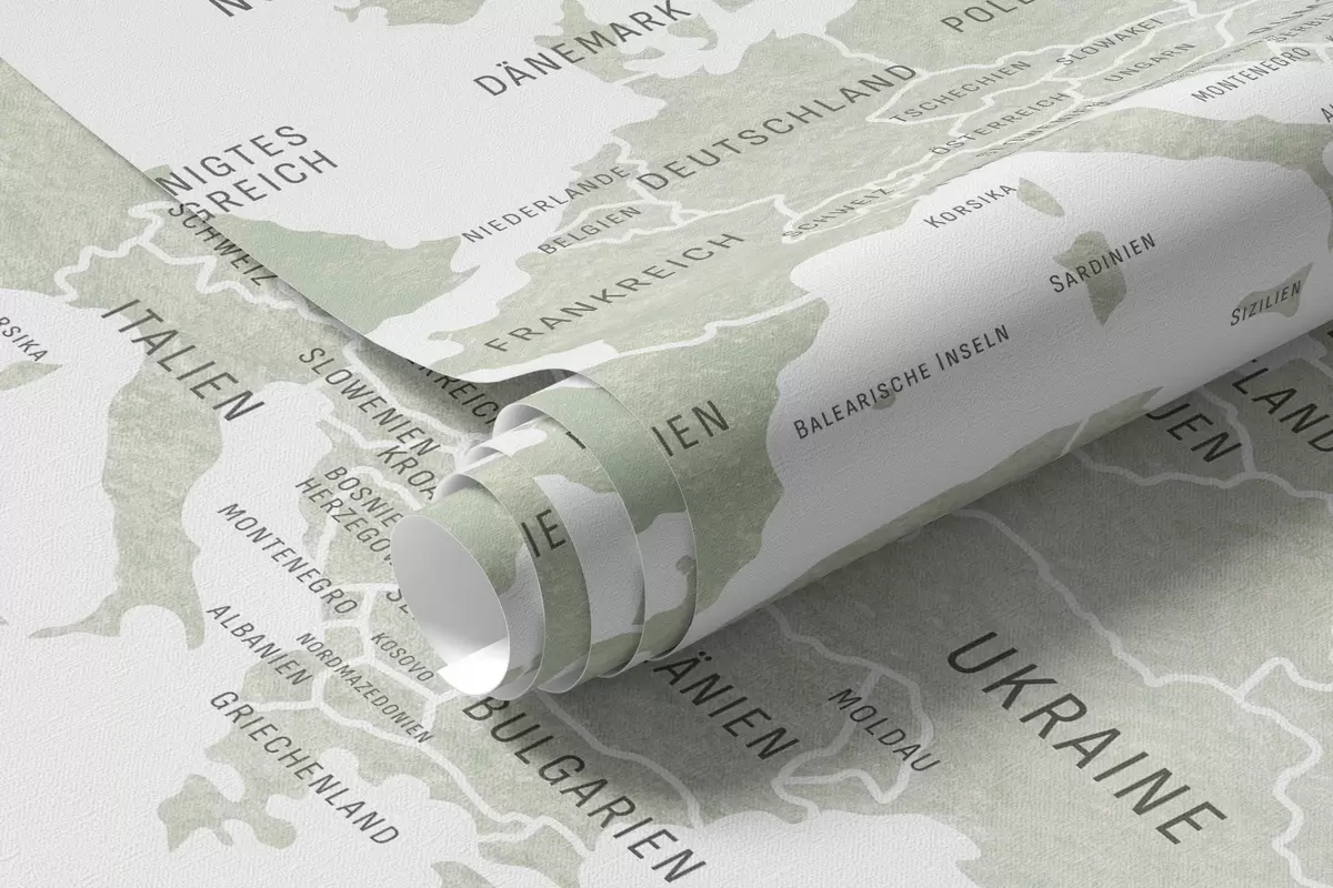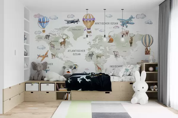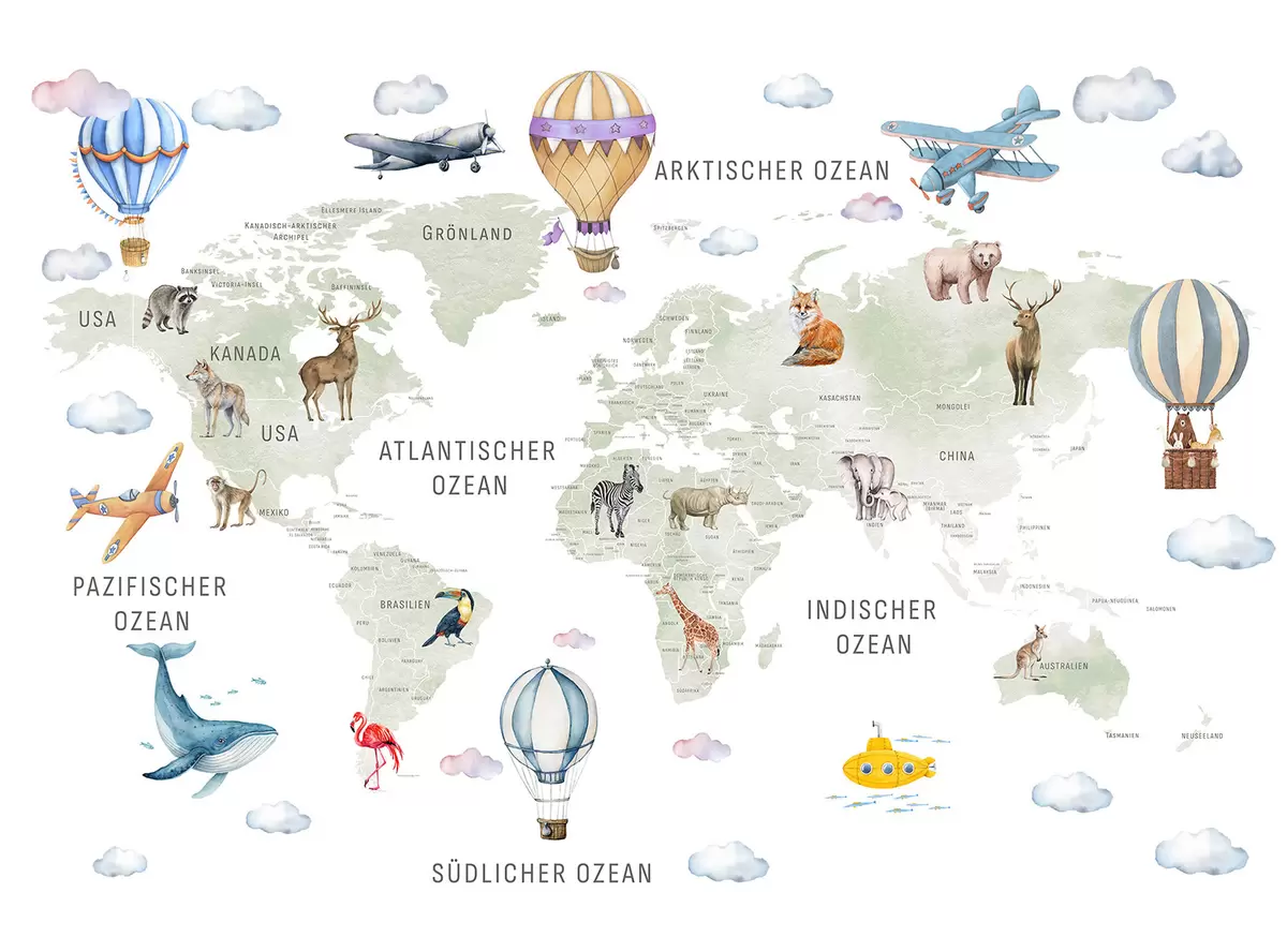 Τοιχογραφίες Παιδικός χάρτης σε στυλ ακουαρέλας με ζώα και αερόστατα. Γερμανική γλώσσα. Πράσινο χρώμα. Nr. c00001de