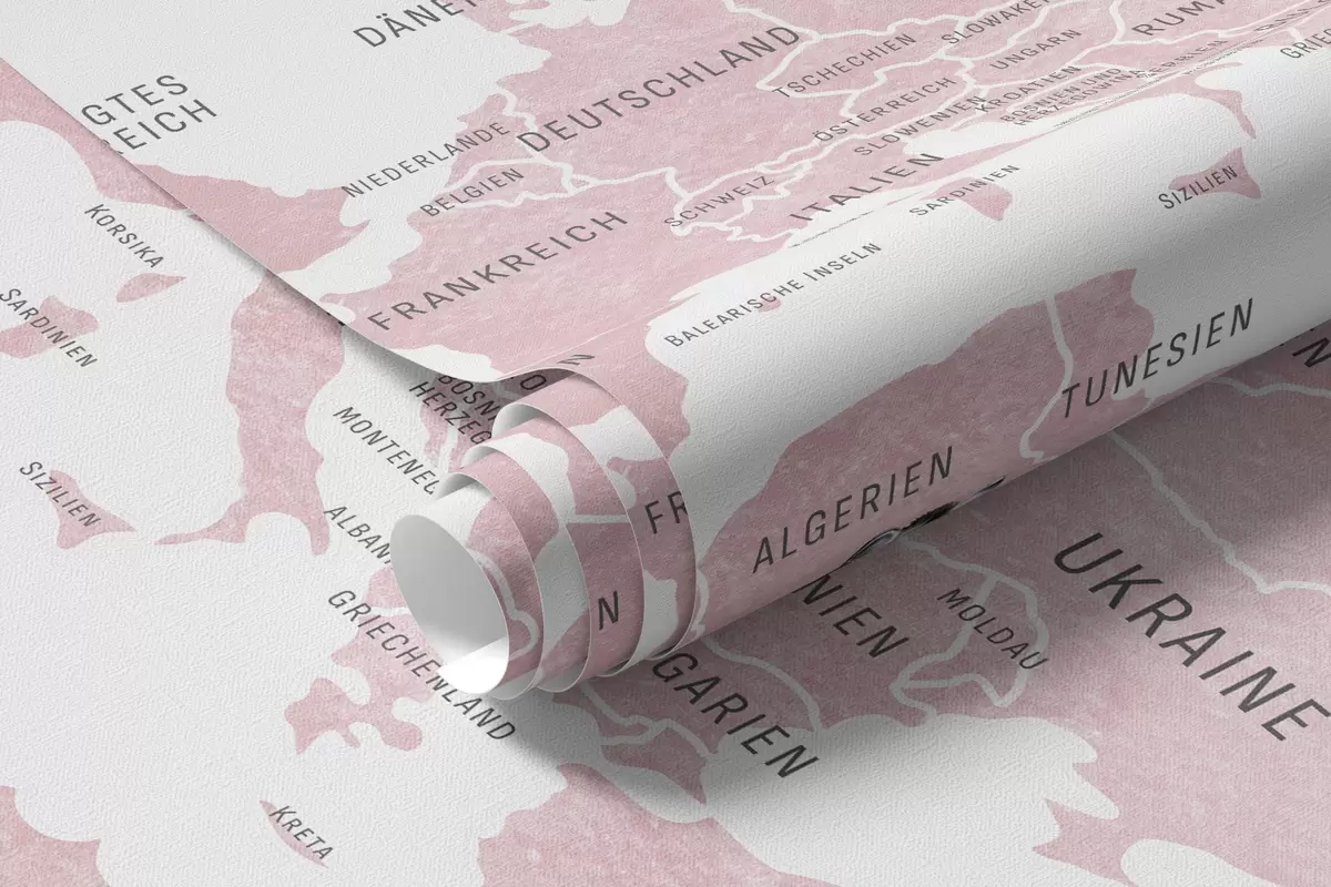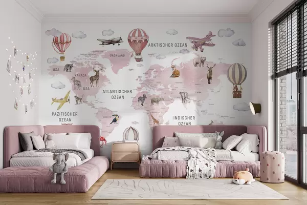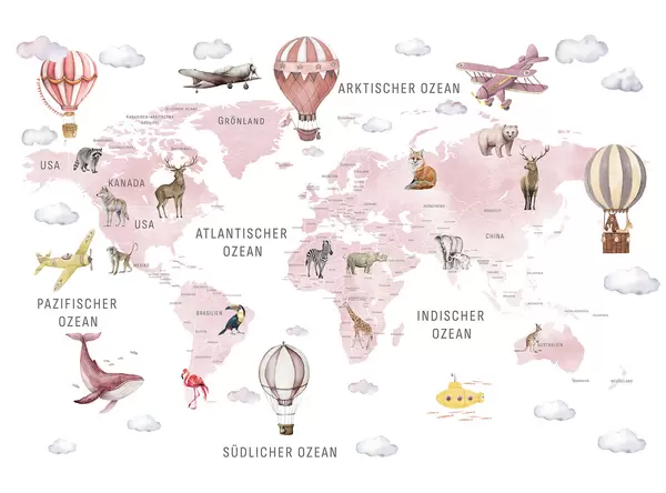 Τοιχογραφίες Παιδικός χάρτης σε στυλ ακουαρέλας με ζώα και αερόστατα. Γερμανική γλώσσα. Ροζ χρώμα. Nr. c00001dev3
