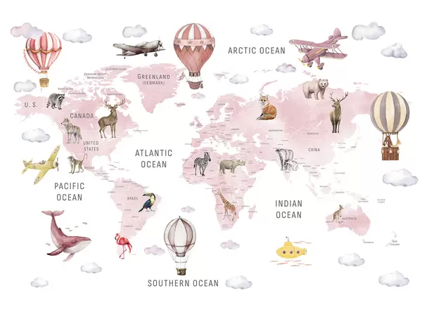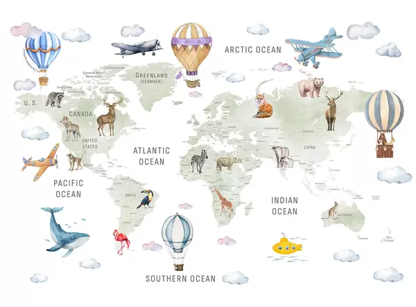 Τοιχογραφίες Παιδικός χάρτης σε στυλ ακουαρέλας με ζώα και αερόστατα. Αγγλική γλώσσα. Μπεζ χρώμα. Nr. c00001env2