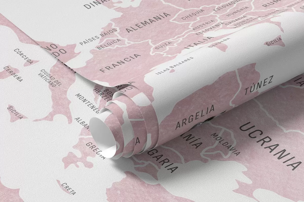 Τοιχογραφίες Παιδικός χάρτης σε στυλ ακουαρέλας με ζώα και αερόστατα. Ισπανική γλώσσα. Ροζ χρώμα. Nr. c00001esv3