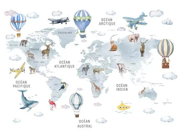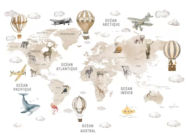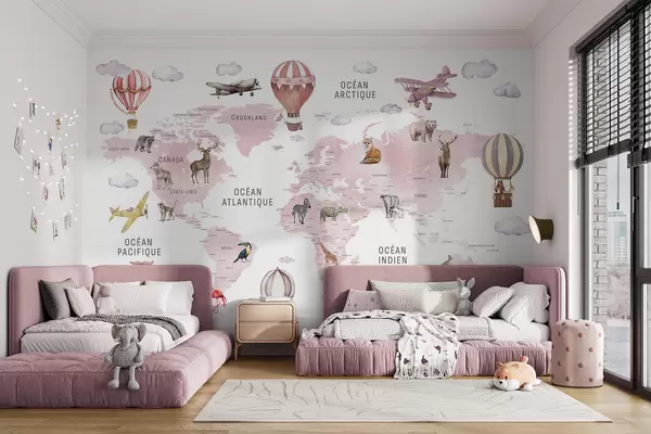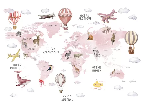 Τοιχογραφίες Παιδικός χάρτης σε στυλ ακουαρέλας με ζώα και αερόστατα. Γαλλική γλώσσα. Ροζ χρώμα. Nr. c00001frv3