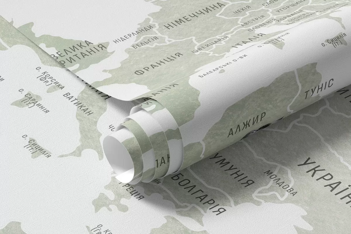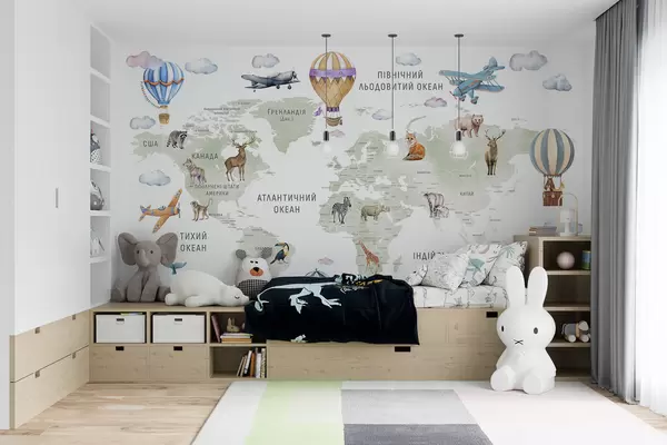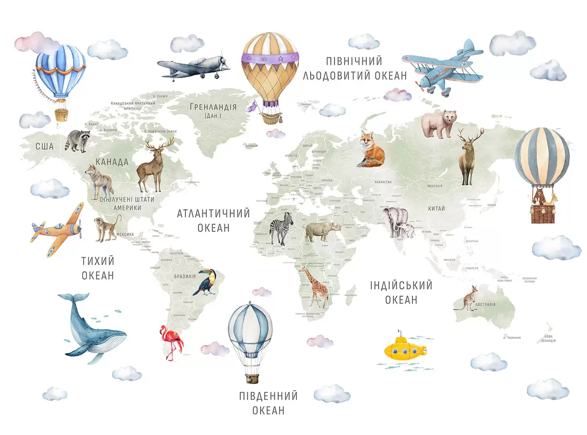 Τοιχογραφίες Παιδικός χάρτης σε στυλ ακουαρέλας με ζώα και αερόστατα. Ουκρανική γλώσσα. Πράσινο χρώμα. Nr. c00001uk