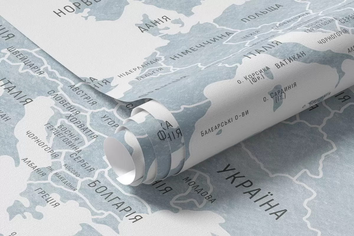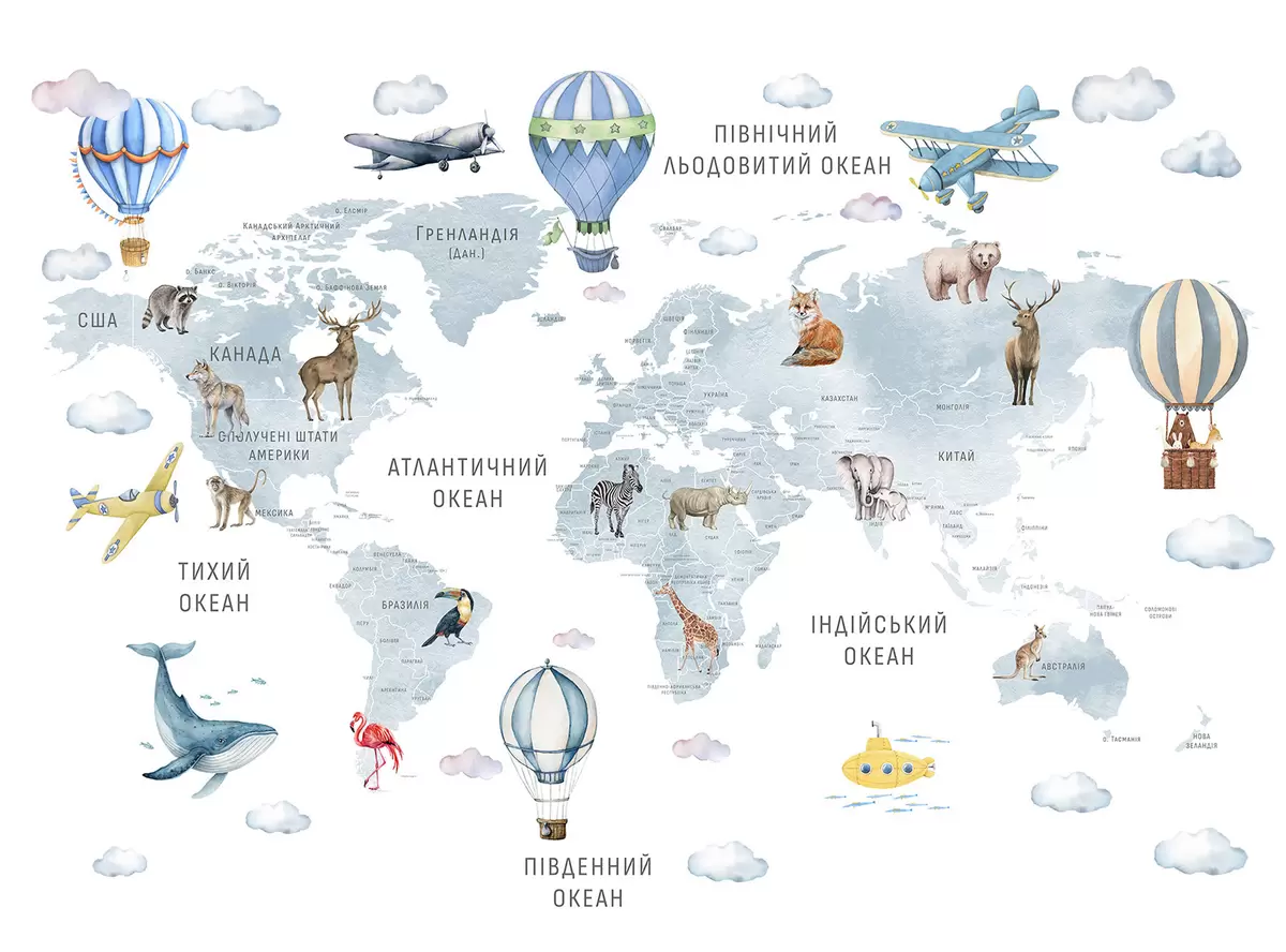 Τοιχογραφίες Παιδικός χάρτης σε στυλ ακουαρέλας με ζώα και αερόστατα. Ουκρανική γλώσσα. Μπλε χρώμα. Nr. c00001ukv1