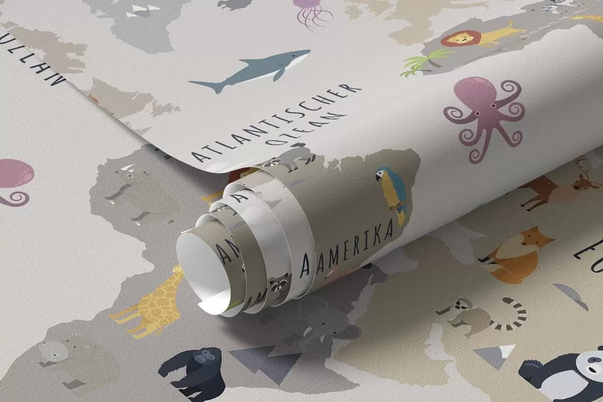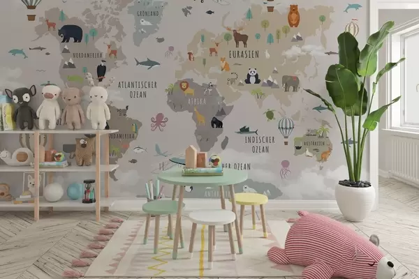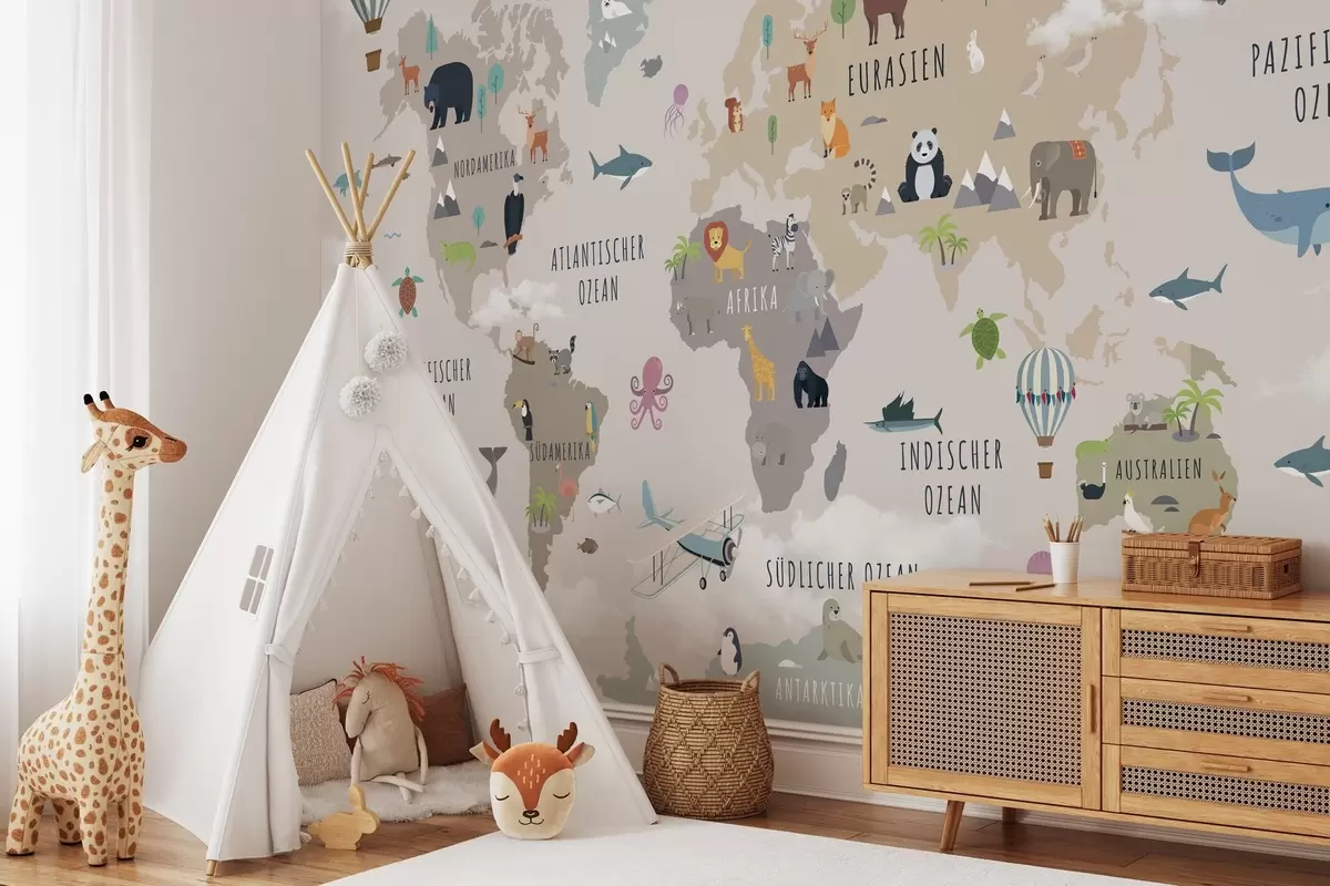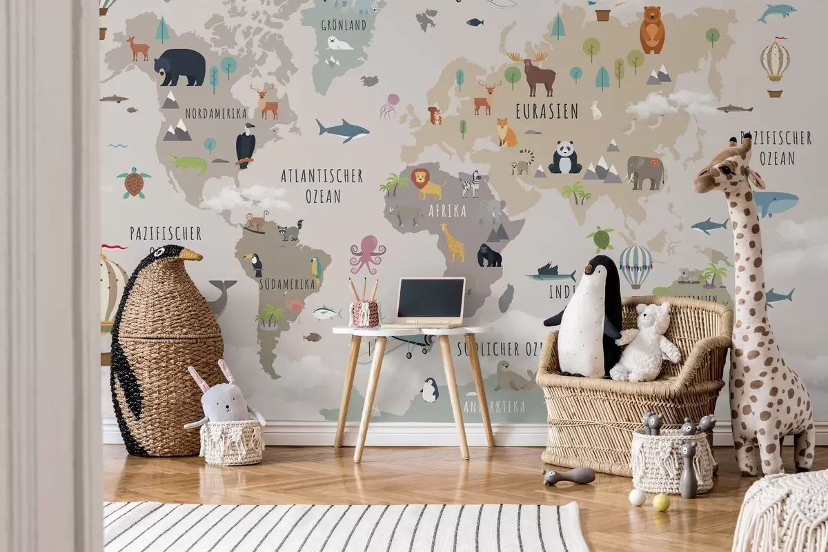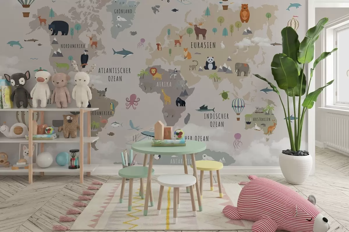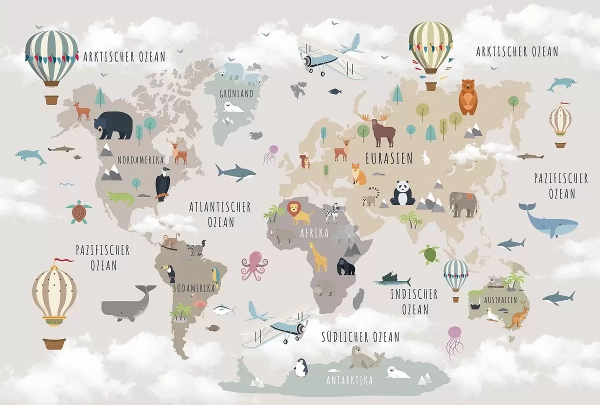 Τοιχογραφίες Παιδικός παγκόσμιος χάρτης με ζώα και αερόστατα. Γερμανική γλώσσα Nr. c00002de