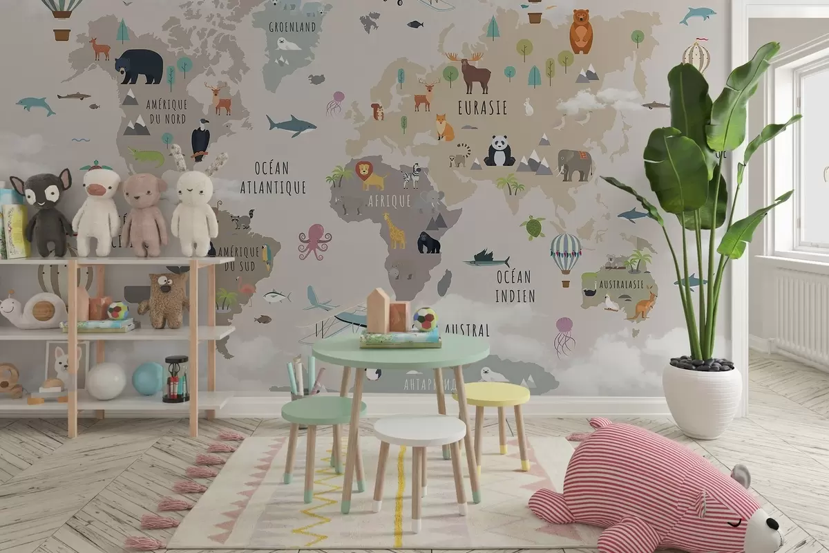 Τοιχογραφίες Παιδικός παγκόσμιος χάρτης με ζώα και αερόστατα. Γαλλική γλώσσα Nr. c00002fr
