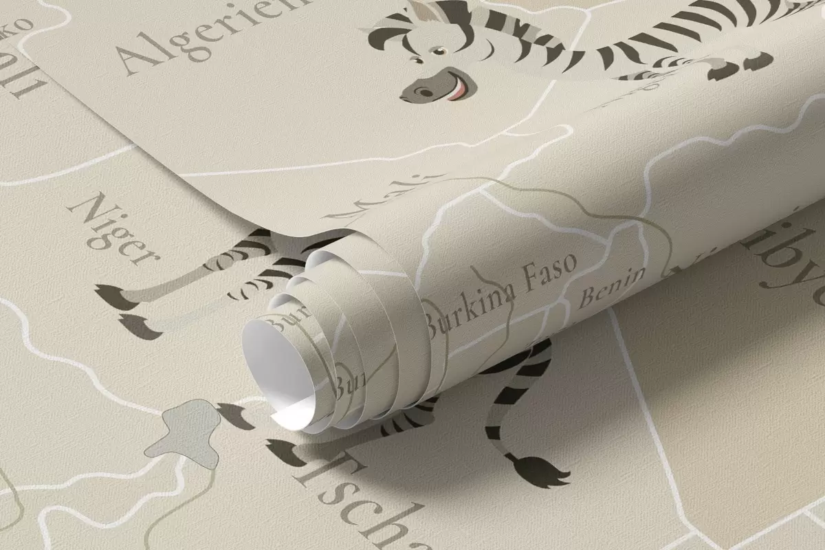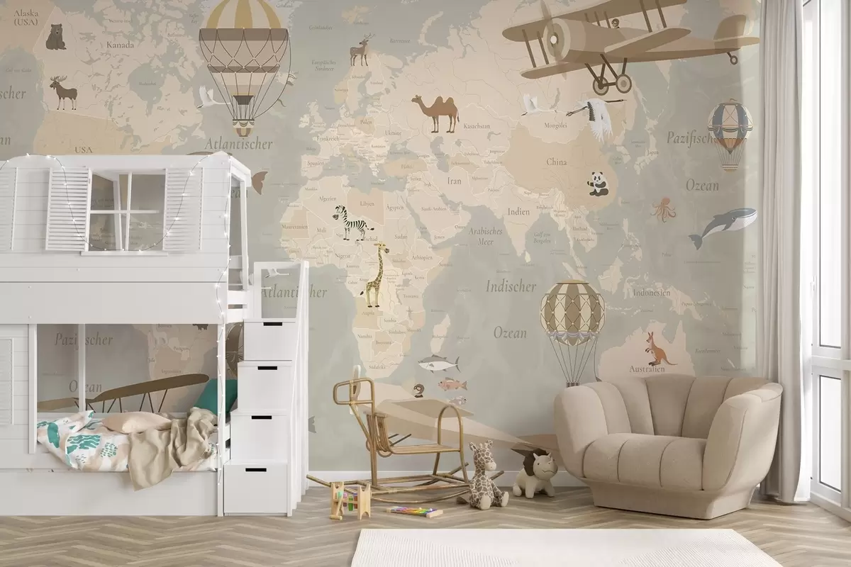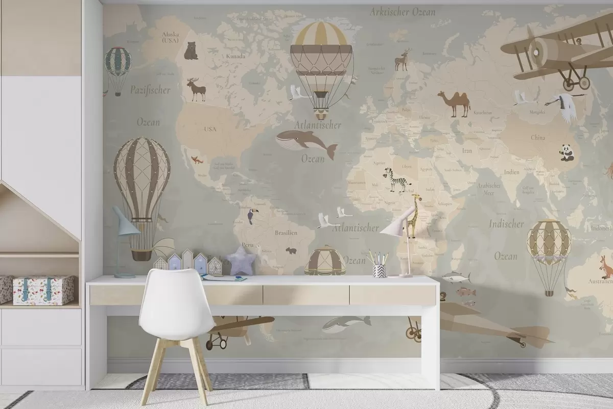 Τοιχογραφίες Παιδικός παγκόσμιος χάρτης με ζώα, αεροπλάνα και αερόστατα. Γερμανική γλώσσα. Μπεζ χρώμα Nr. c00003de