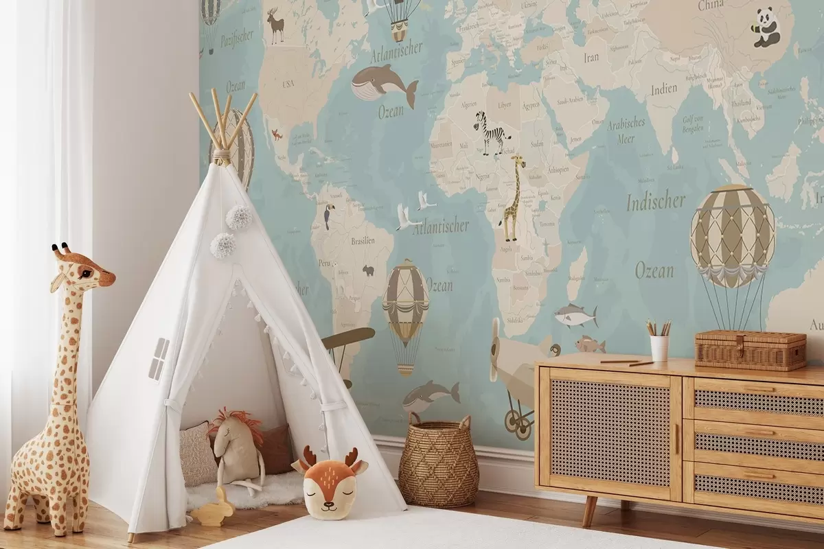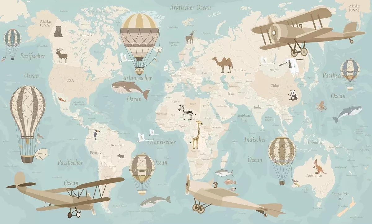 Τοιχογραφίες Παιδικός παγκόσμιος χάρτης με ζώα, αεροπλάνα και αερόστατα. Γερμανική γλώσσα. Μπλε χρώμα. Nr. c00003dev1