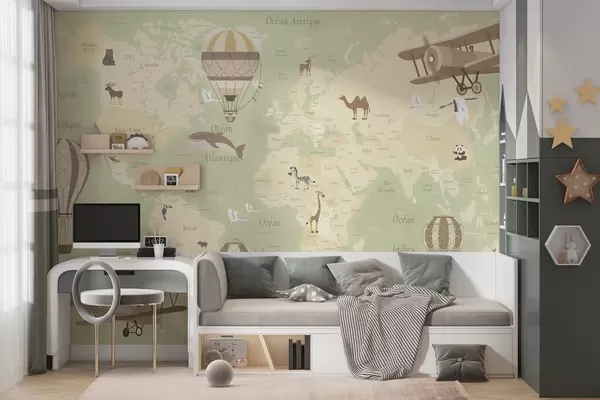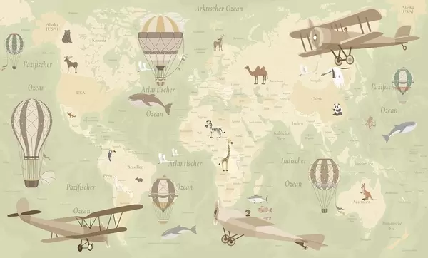 Τοιχογραφίες Παιδικός παγκόσμιος χάρτης με ζώα, αεροπλάνα και αερόστατα. Γερμανική γλώσσα. Πράσινο χρώμα. Nr. c00003dev2