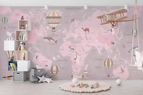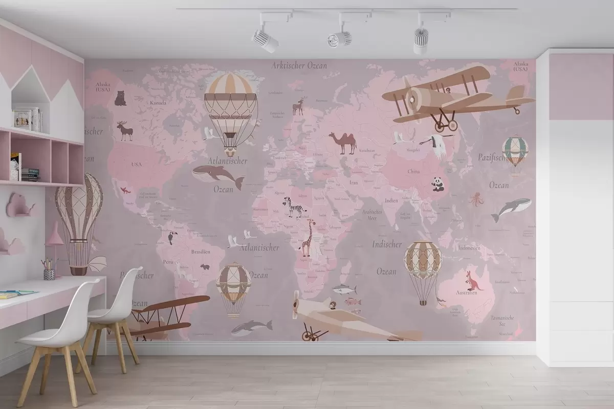 Τοιχογραφίες Παιδικός παγκόσμιος χάρτης με ζώα, αεροπλάνα και αερόστατα. Γερμανική γλώσσα. Ροζ χρώμα. Nr. c00003dev3