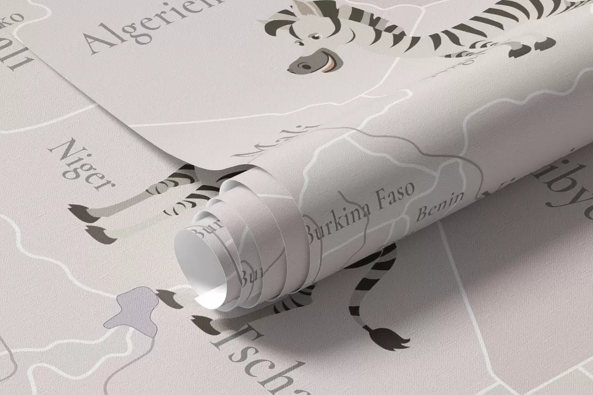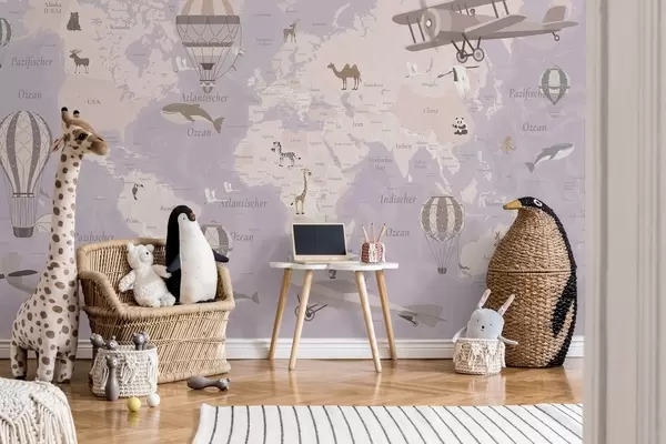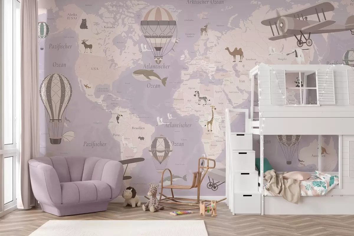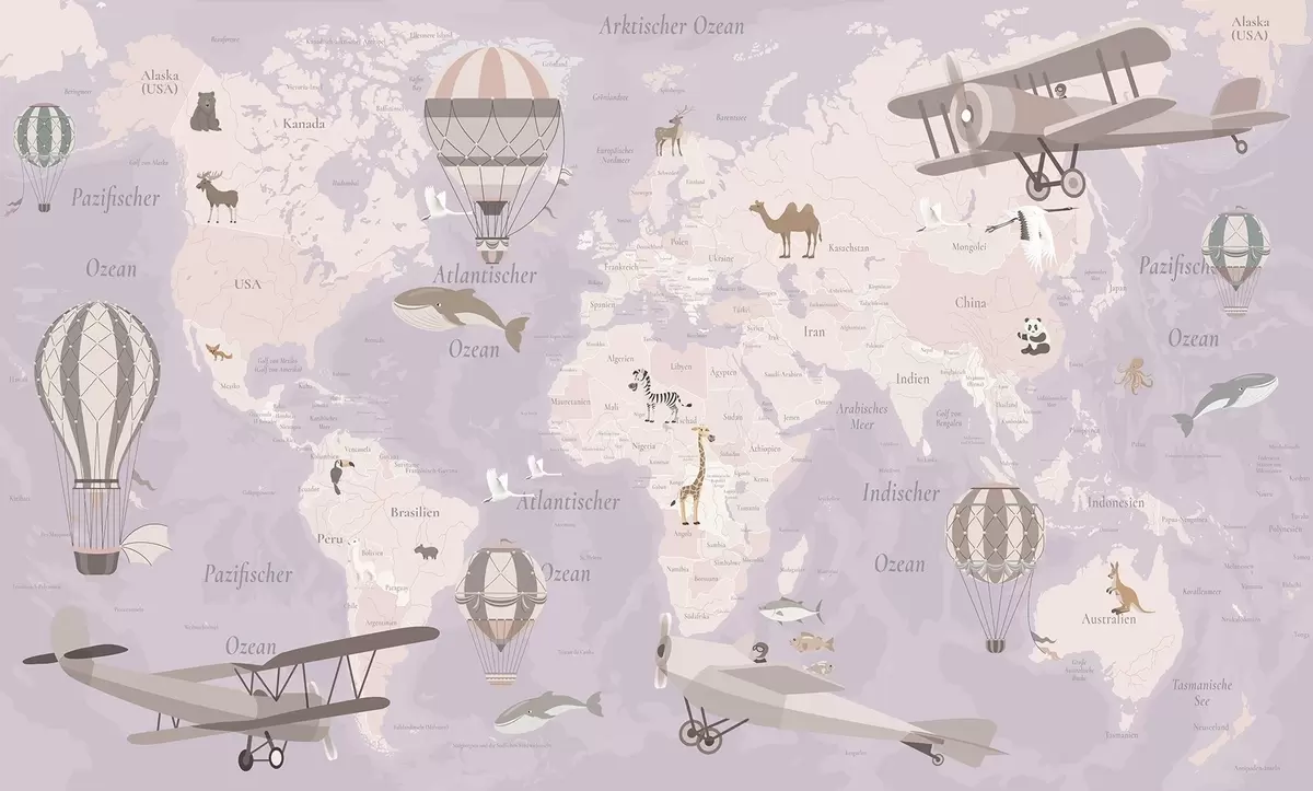 Τοιχογραφίες Παιδικός παγκόσμιος χάρτης με ζώα, αεροπλάνα και αερόστατα. Γερμανική γλώσσα. Μωβ χρώμα. Nr. c00003dev4