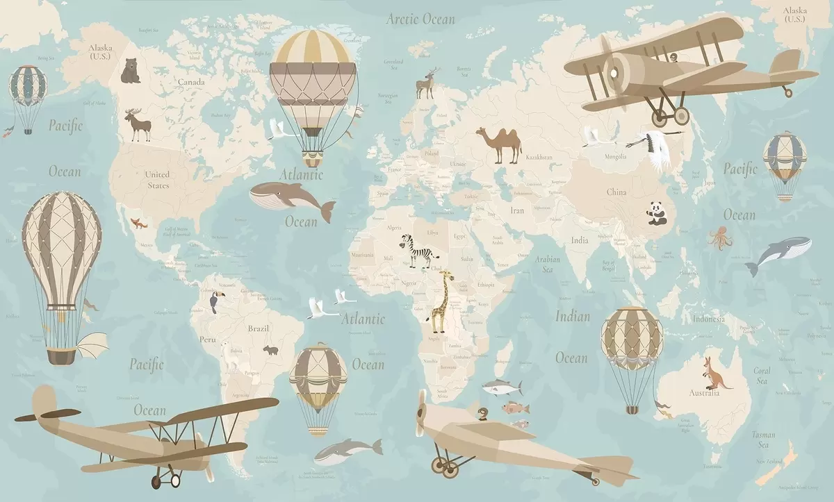 Τοιχογραφίες Παιδικός παγκόσμιος χάρτης με ζώα, αεροπλάνα και αερόστατα. Αγγλική γλώσσα. Μπλε χρώμα. Nr. c00003env1