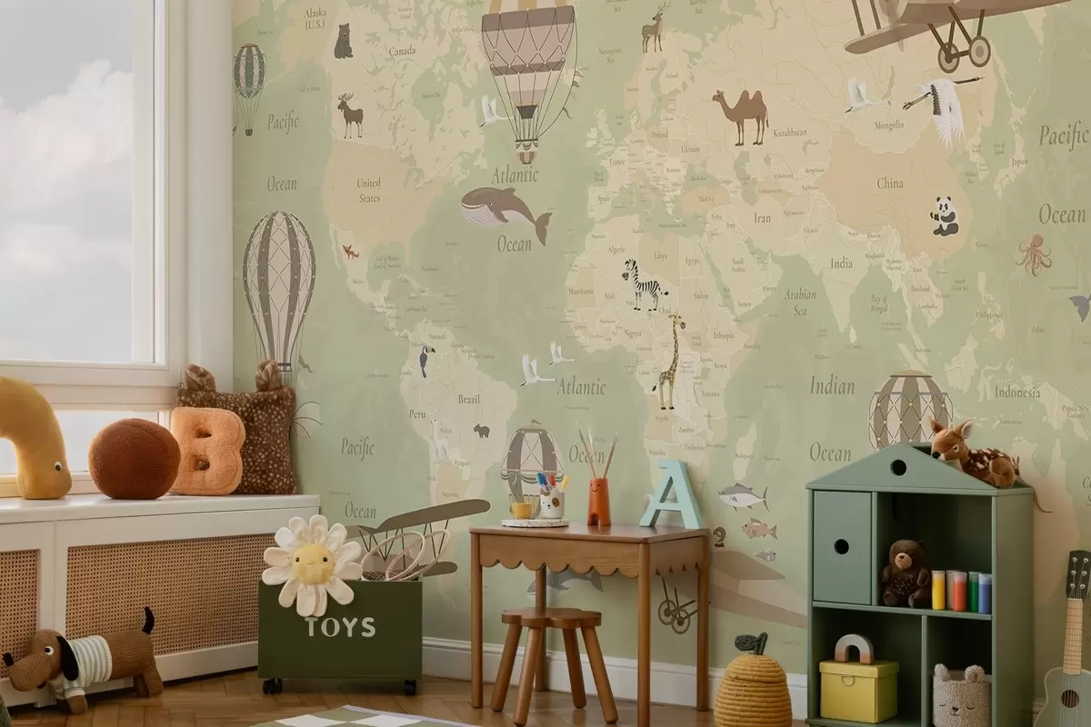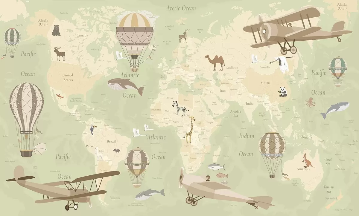 Τοιχογραφίες Παιδικός παγκόσμιος χάρτης με ζώα, αεροπλάνα και αερόστατα. Αγγλική γλώσσα. Πράσινο χρώμα. Nr. c00003env2