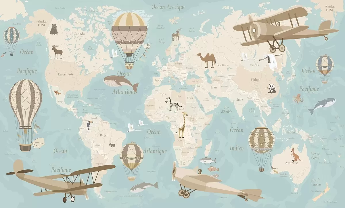 Τοιχογραφίες Παιδικός παγκόσμιος χάρτης με ζώα, αεροπλάνα και αερόστατα. Γαλλική γλώσσα. Μπλε χρώμα. Nr. c00003frv1