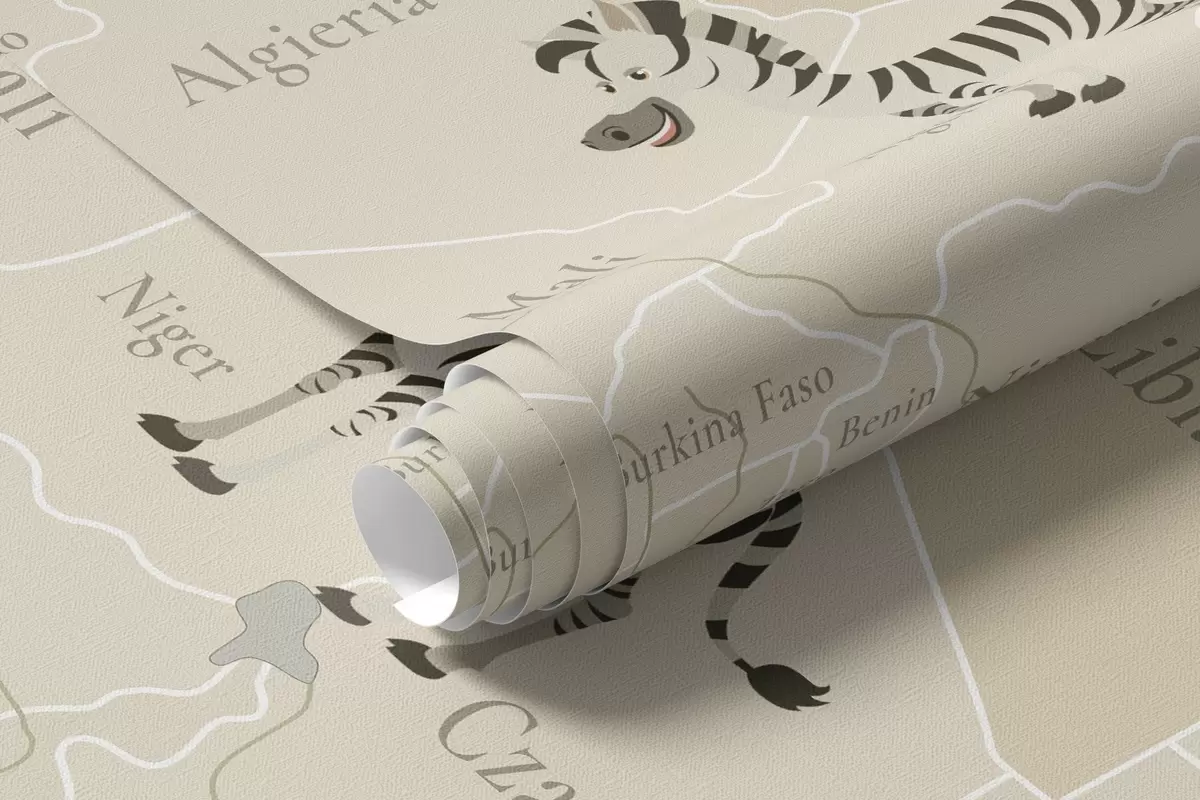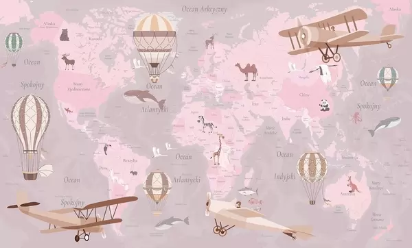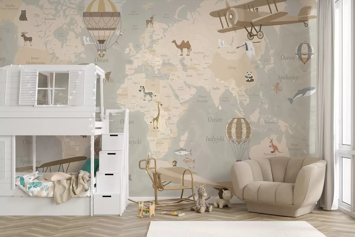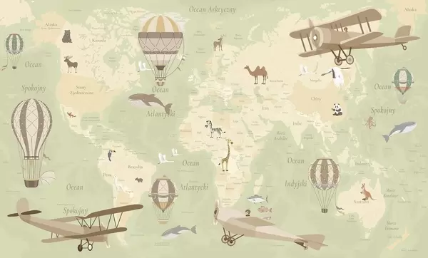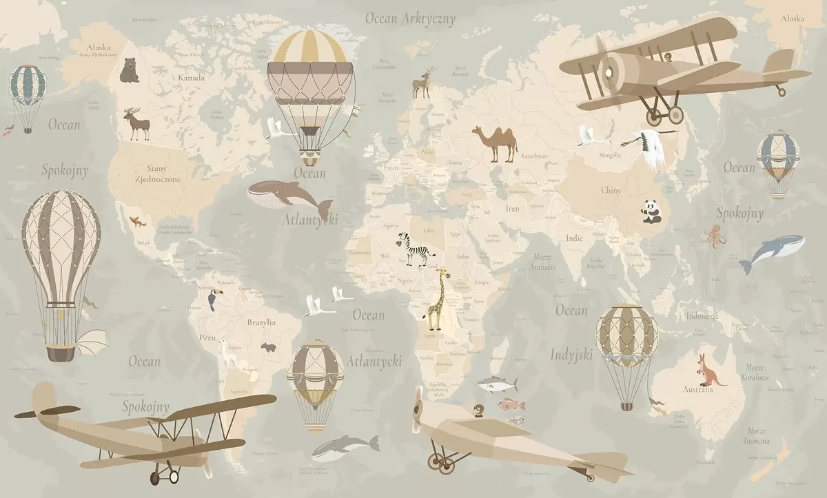 Τοιχογραφίες Παιδικός παγκόσμιος χάρτης με ζώα, αεροπλάνα και αερόστατα. Πολωνική γλώσσα. Μπεζ χρώμα. Nr. c00003pl