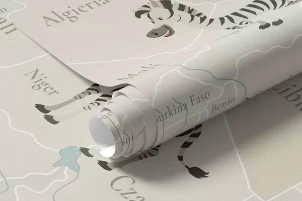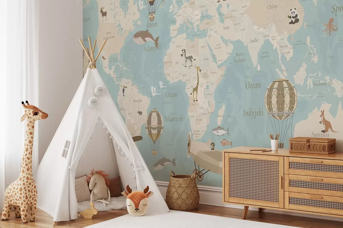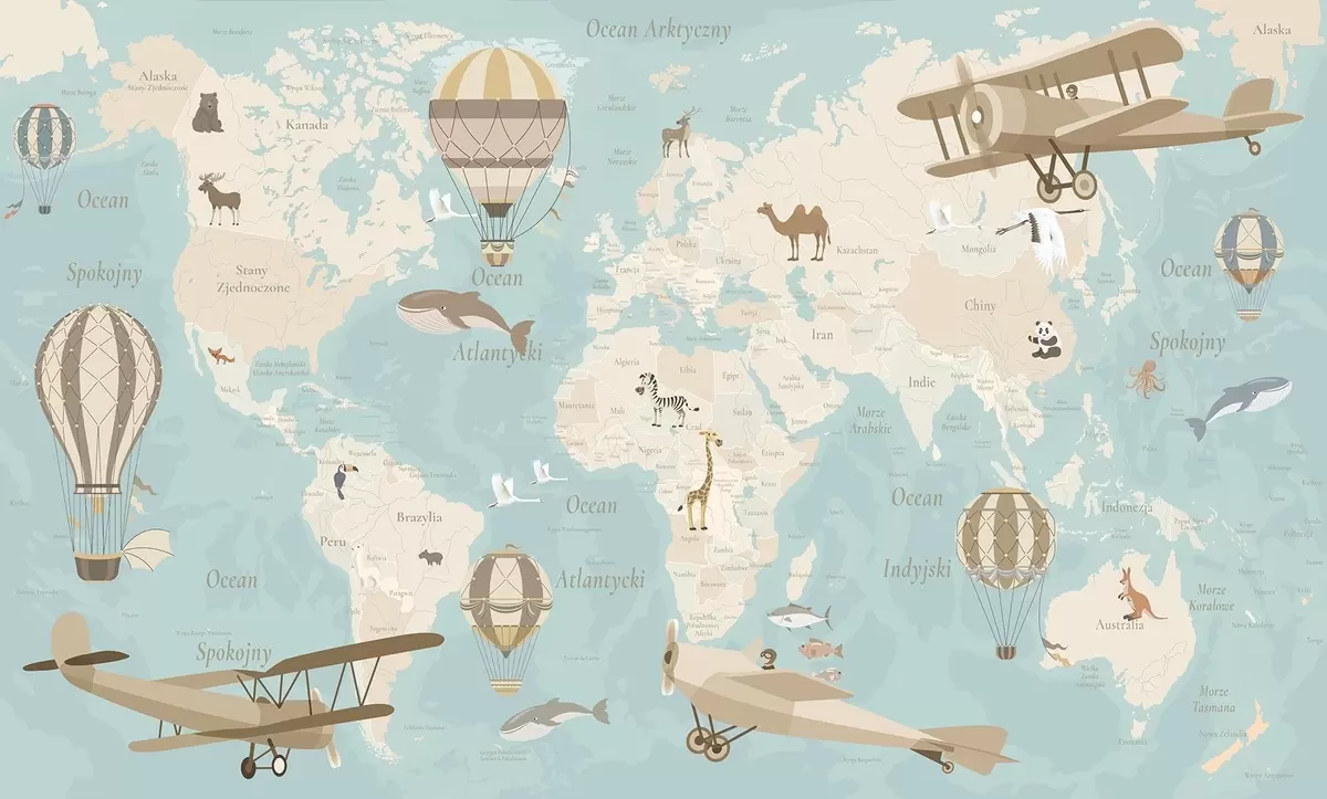 Τοιχογραφίες Παιδικός παγκόσμιος χάρτης με ζώα, αεροπλάνα και αερόστατα. Πολωνική γλώσσα. Μπλε χρώμα. Nr. c00003plv1