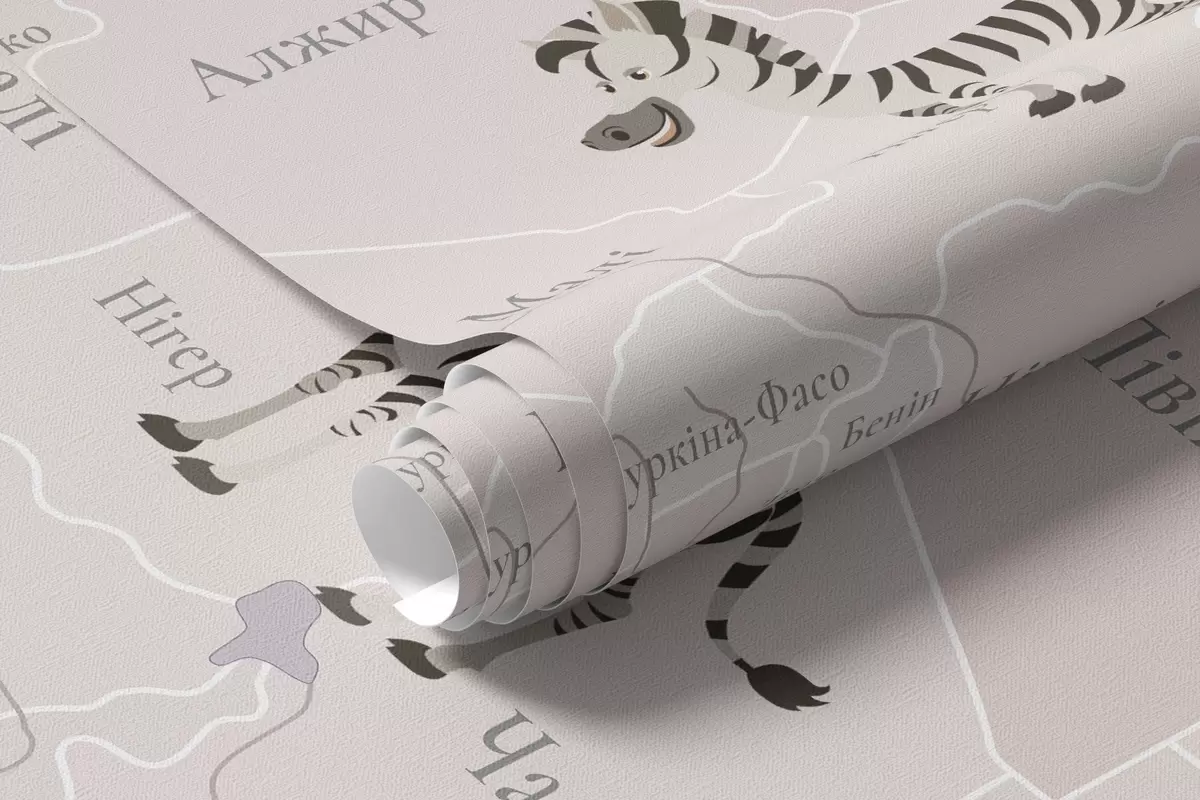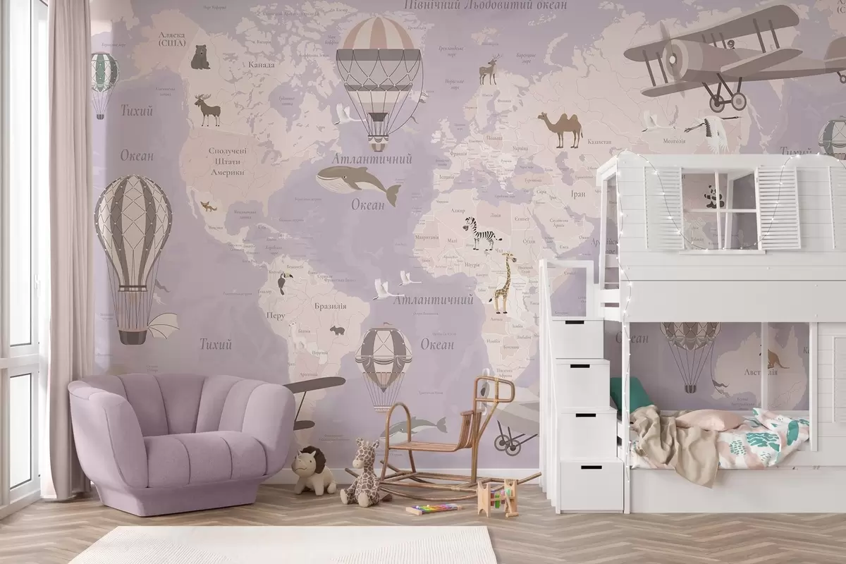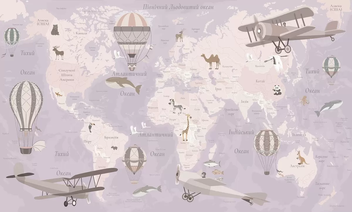 Τοιχογραφίες Παιδικός παγκόσμιος χάρτης με ζώα, αεροπλάνα και αερόστατα. Ουκρανική γλώσσα. Μωβ χρώμα. Nr. c00003ukv4