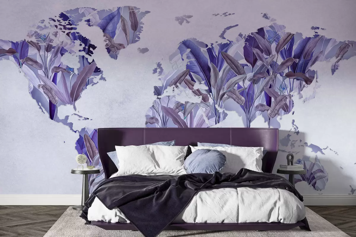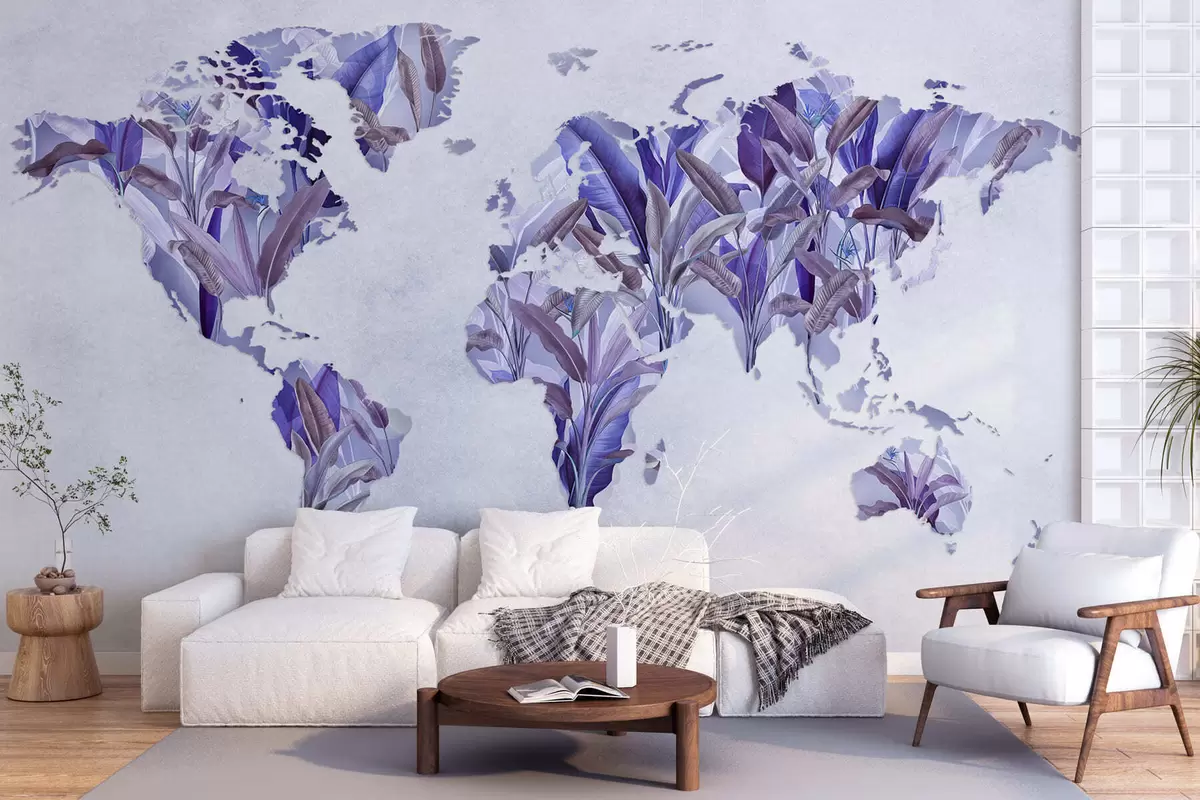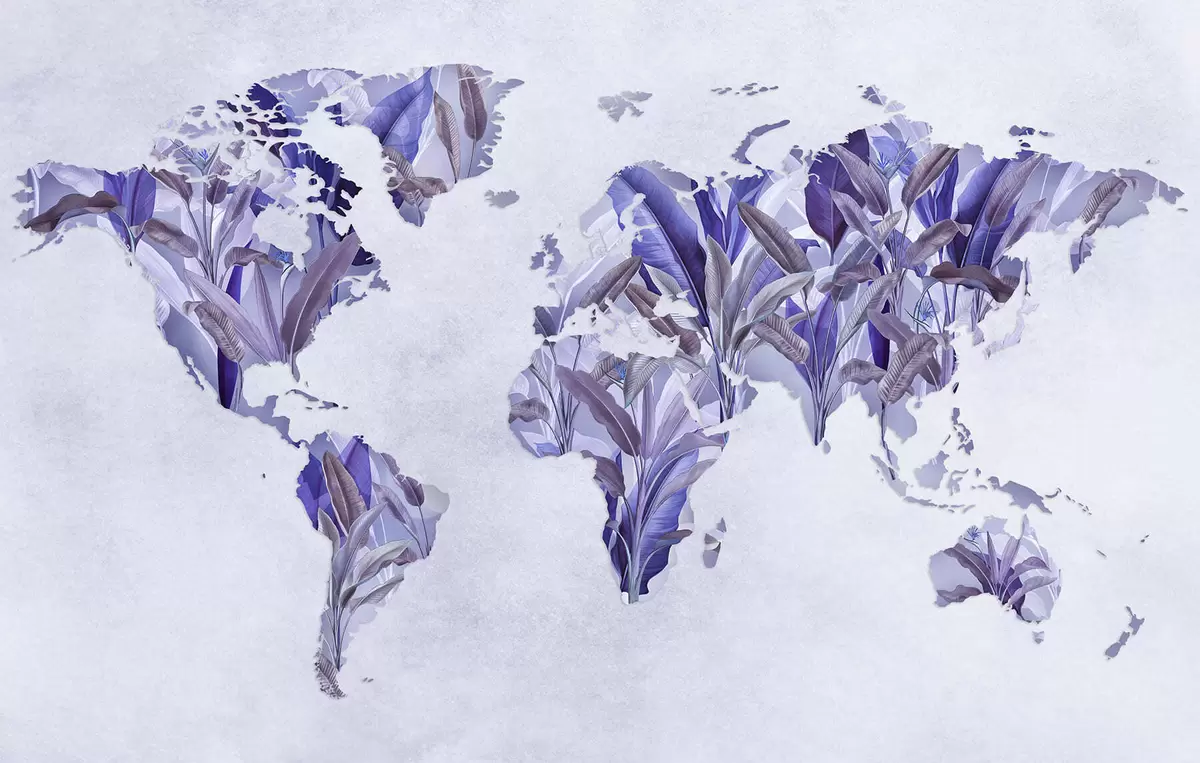 Τοιχογραφίες Ένας μωβ χάρτης του κόσμου φτιαγμένος από φύλλα μπανάνας Nr. c00007v1