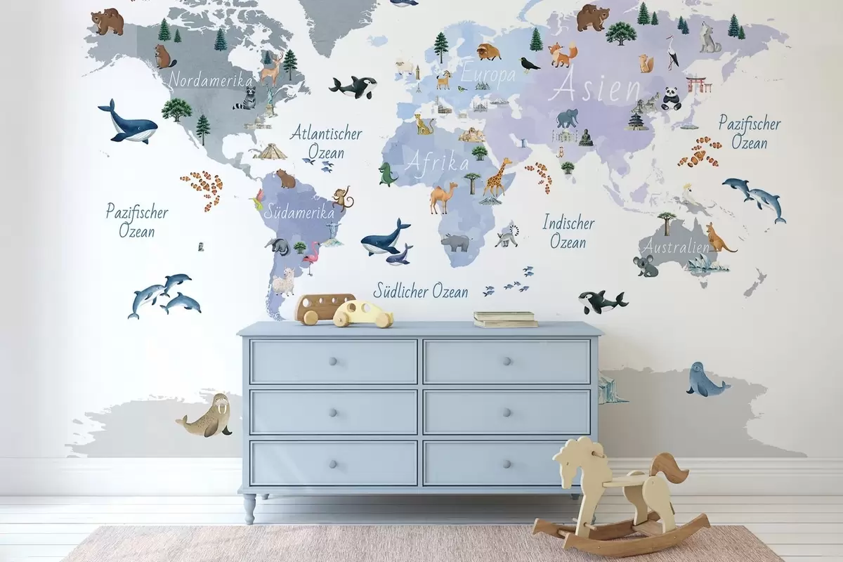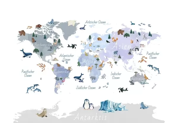 Τοιχογραφίες Ένας μπλε χάρτης σε στυλ ακουαρέλας με ζώα, φυτά και αρχιτεκτονικά στοιχεία. Επιγραφές στα γερμανικά Nr. c00009dev1