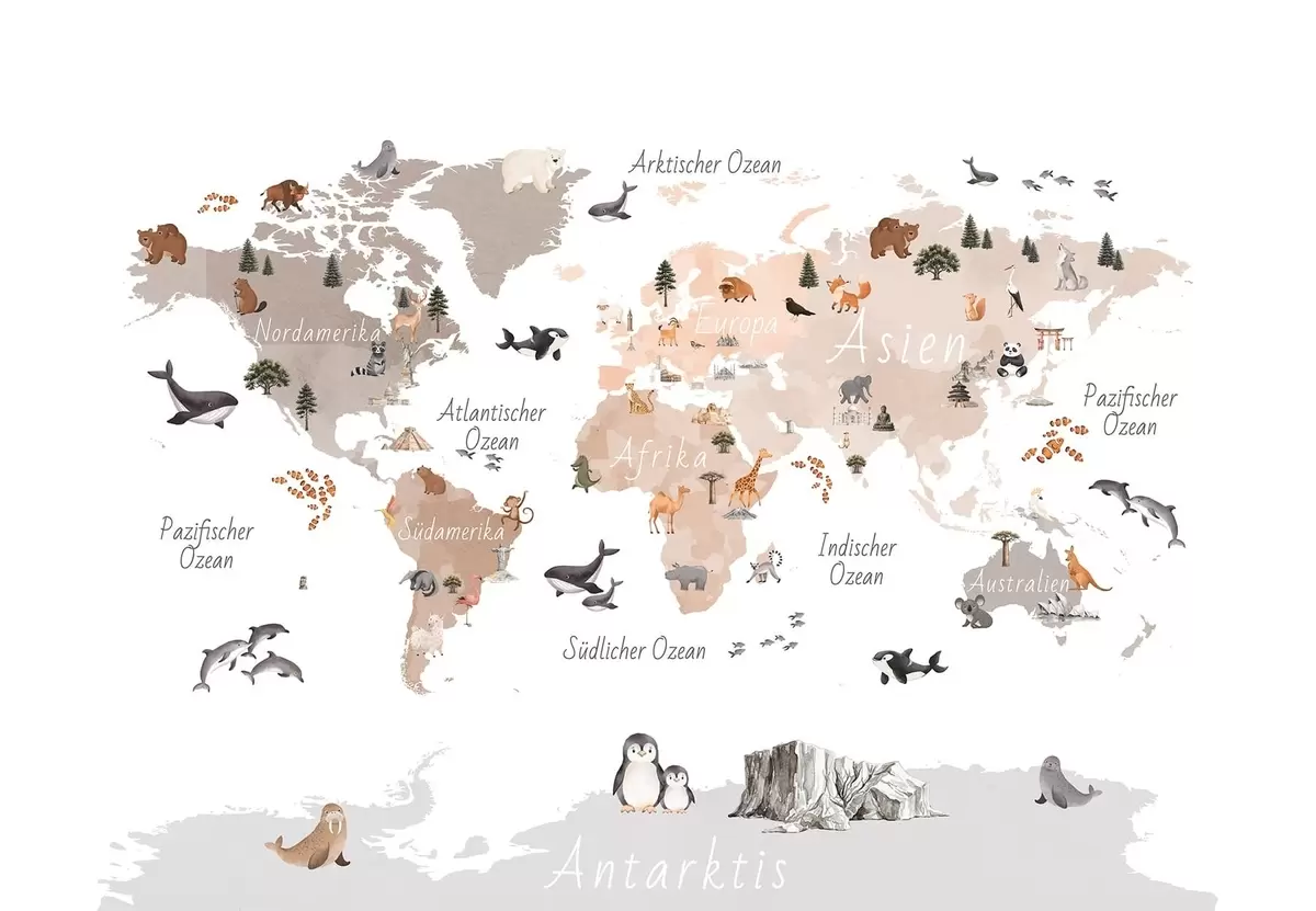 Τοιχογραφίες Ένας χάρτης σε μπεζ χρώμα, σε στυλ ακουαρέλας, με ζώα, φυτά και αρχιτεκτονικά στοιχεία. Επιγραφές στα γερμανικά Nr. c00009dev3