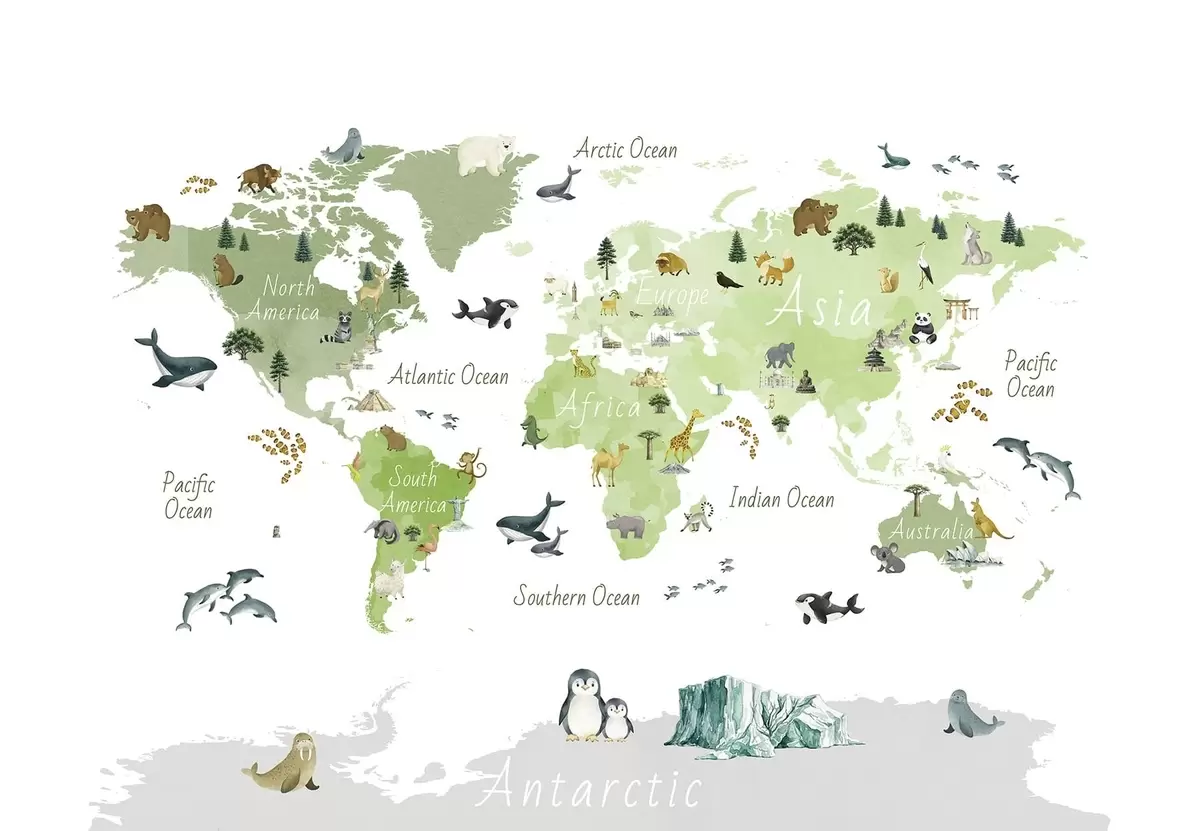 Τοιχογραφίες Ένας χάρτης σε πράσινο χρώμα, σε στυλ ακουαρέλας, με ζώα, φυτά και αρχιτεκτονικά στοιχεία. Επιγραφές στα αγγλικά Nr. c00009env2