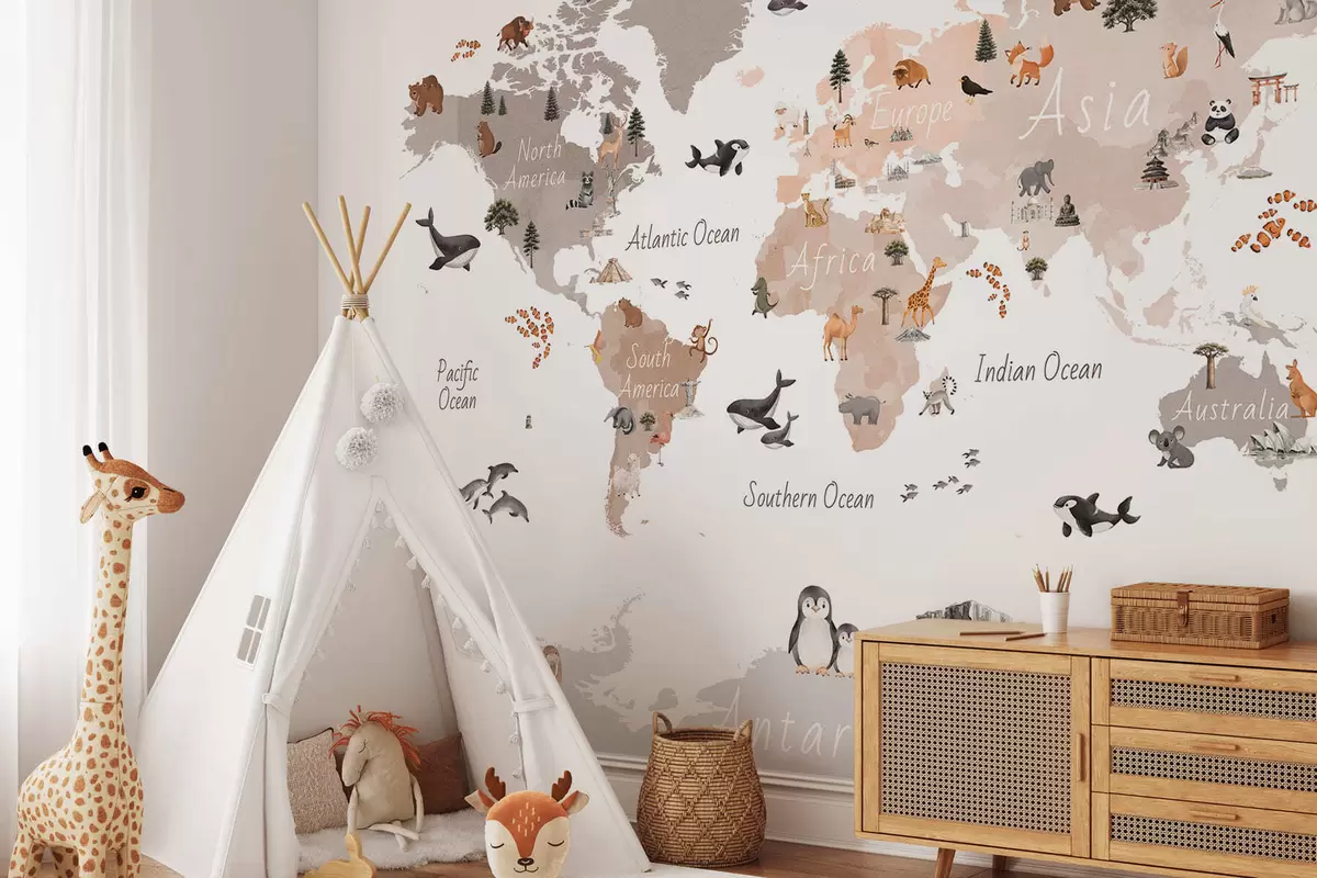 Τοιχογραφίες Ένας χάρτης σε μπεζ χρώμα, σε στυλ ακουαρέλας, με ζώα, φυτά και αρχιτεκτονικά στοιχεία. Επιγραφές στα αγγλικά Nr. c00009env3