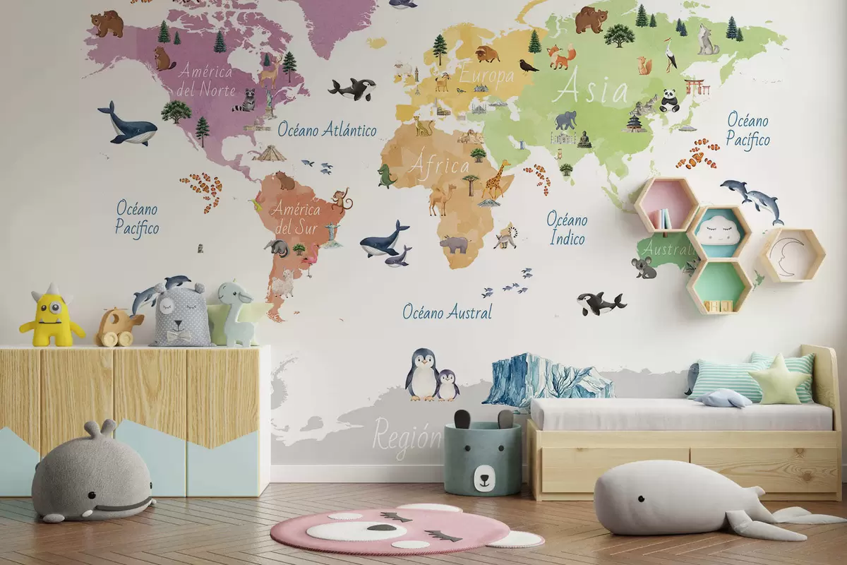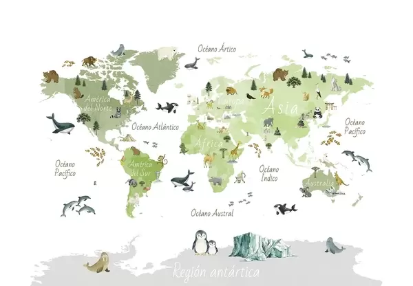 Τοιχογραφίες Ένας έγχρωμος χάρτης σε στυλ ακουαρέλας με ζώα, φυτά και αρχιτεκτονικά στοιχεία. Επιγραφές στα ισπανικά Nr. c00009es