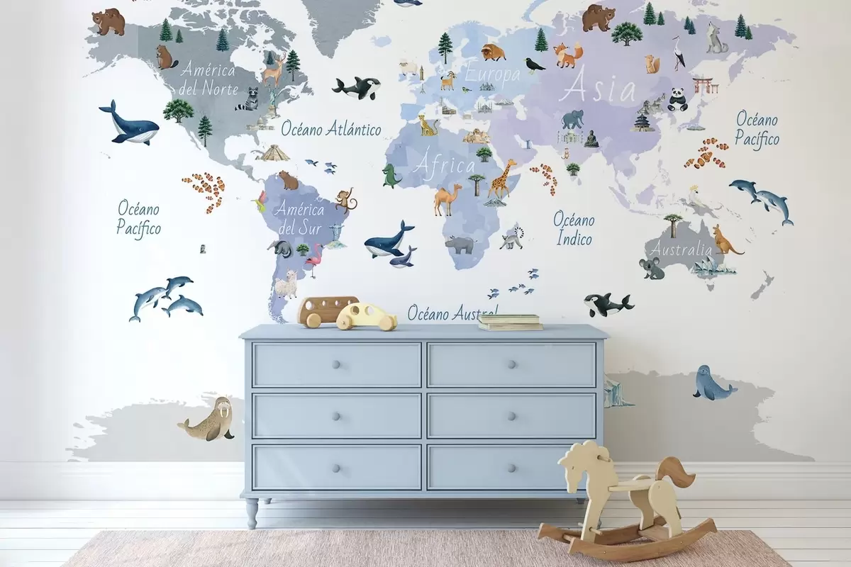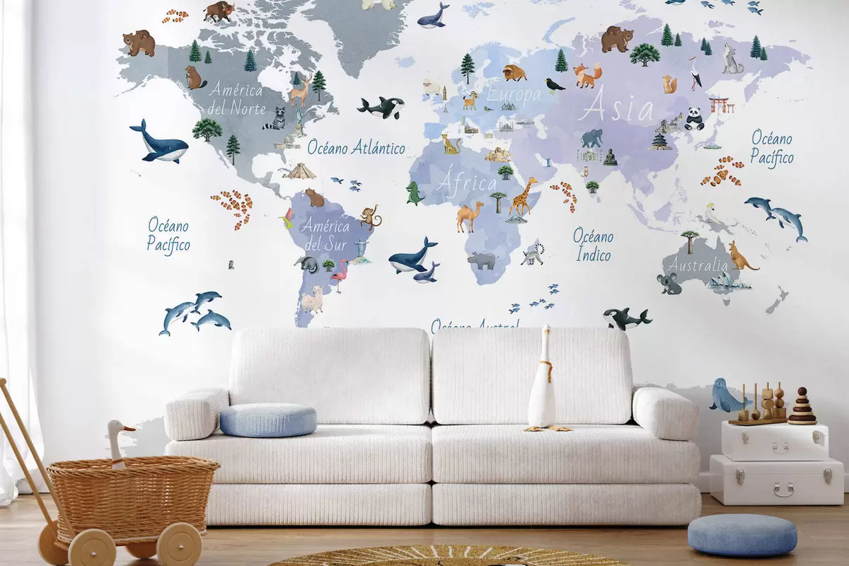 Τοιχογραφίες Ένας μπλε χάρτης σε στυλ ακουαρέλας με ζώα, φυτά και αρχιτεκτονικά στοιχεία. Επιγραφές στα ισπανικά Nr. c00009esv1
