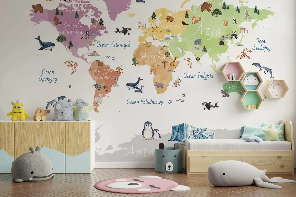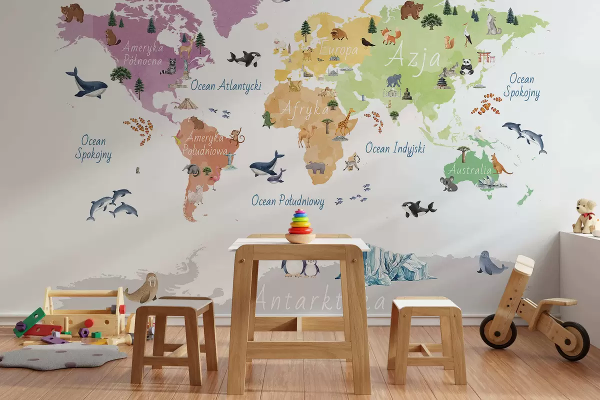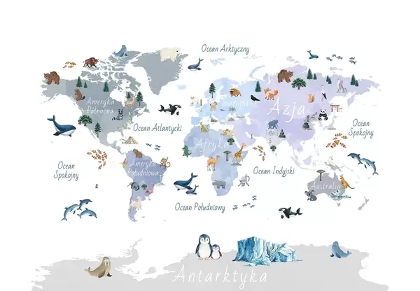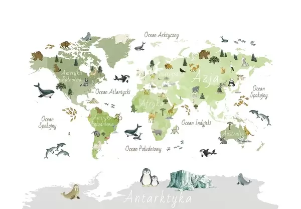 Τοιχογραφίες Ένας έγχρωμος χάρτης σε στυλ ακουαρέλας με ζώα, φυτά και αρχιτεκτονικά στοιχεία. Επιγραφές στα πολωνικά Nr. c00009pl