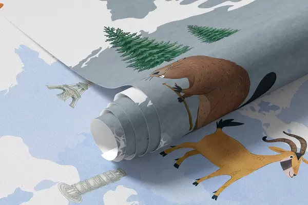Τοιχογραφίες Ένας μπλε χάρτης σε στυλ ακουαρέλας με ζώα, φυτά και αρχιτεκτονικά στοιχεία. Επιγραφές στα ουκρανικά Nr. c00009ukv1