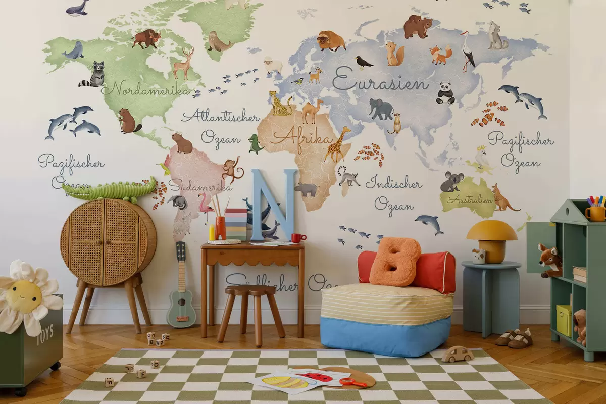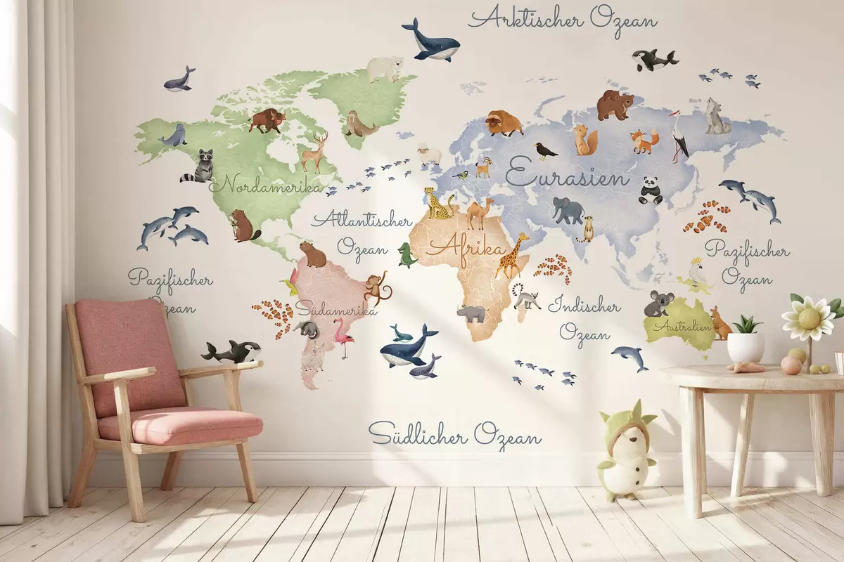 Τοιχογραφίες Ένας λευκός χάρτης σε στυλ ακουαρέλας με ζώα. Επιγραφές στα γερμανικά Nr. c00012de