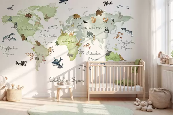 Τοιχογραφίες Ένας χάρτης σε πράσινο χρώμα, σε στυλ ακουαρέλας, με ζώα. Επιγραφές στα γερμανικά Nr. c00012dev2