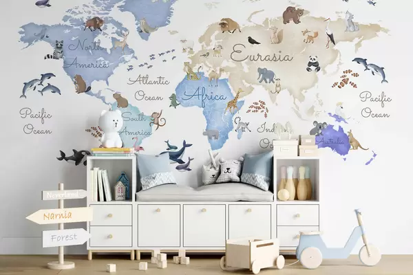 Τοιχογραφίες Ένας μπλε χάρτης σε στυλ ακουαρέλας με ζώα. Επιγραφές στα αγγλικά Nr. c00012env1