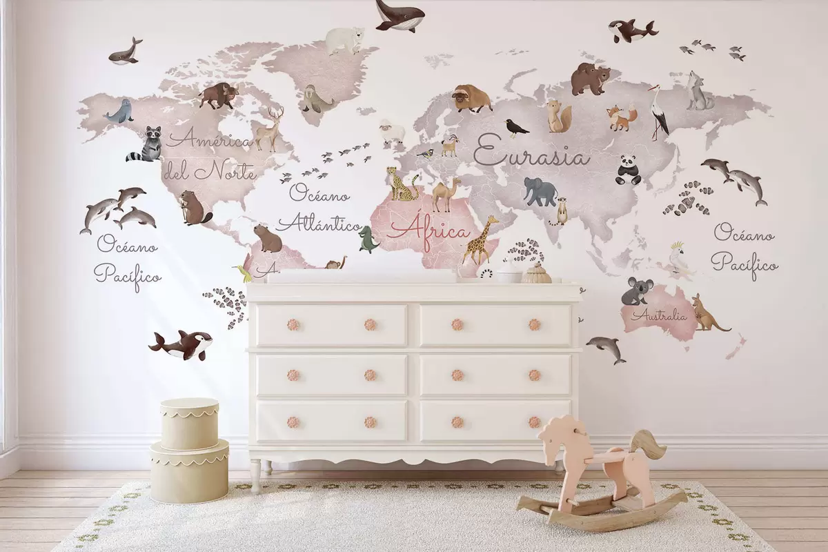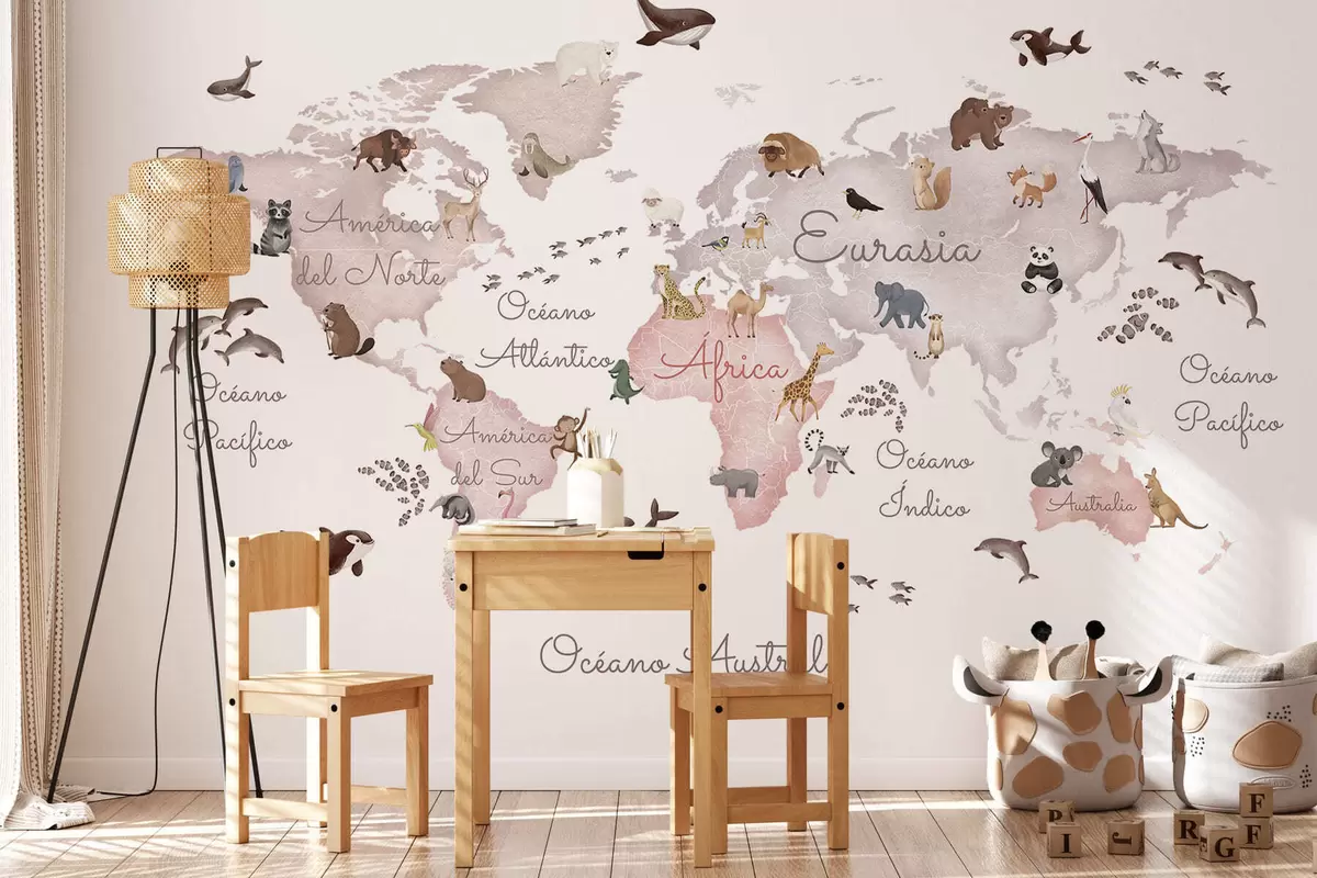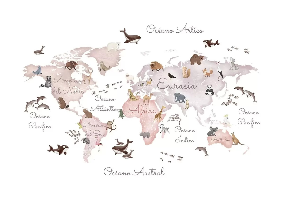 Τοιχογραφίες Ένας χάρτης σε μπεζ χρώμα, σε στυλ ακουαρέλας, με ζώα. Επιγραφές στα ισπανικά Nr. c00012esv3