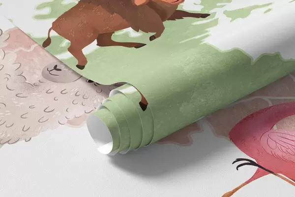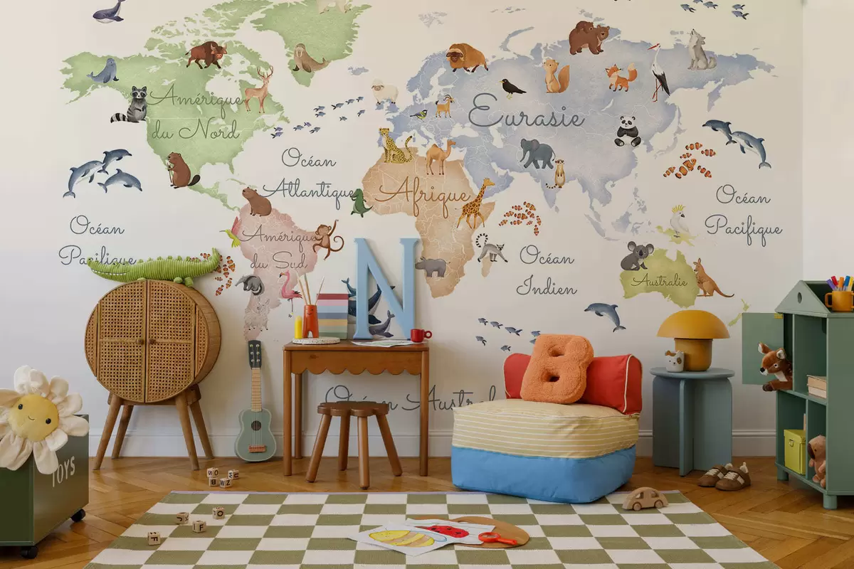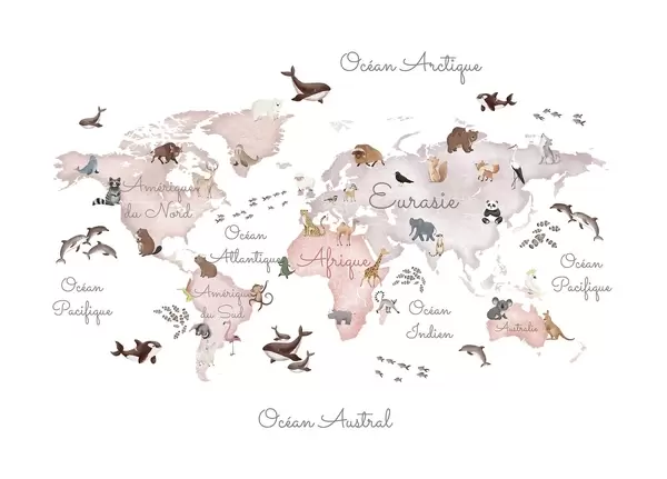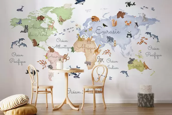 Τοιχογραφίες Ένας έγχρωμος χάρτης σε στυλ ακουαρέλας με ζώα. Επιγραφές στα γαλλικά Nr. c00012fr