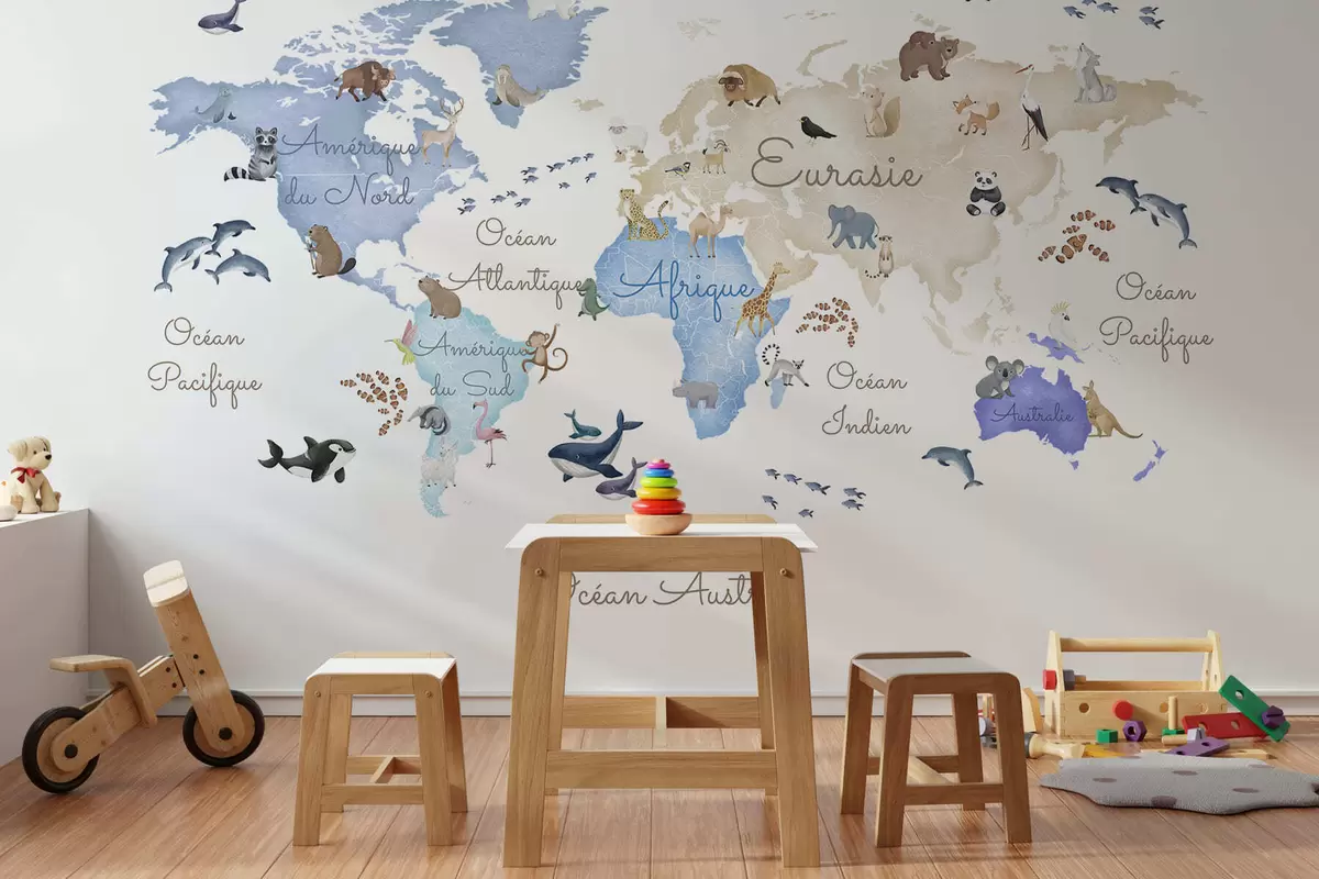Τοιχογραφίες Ένας μπλε χάρτης σε στυλ ακουαρέλας με ζώα. Επιγραφές στα γαλλικά Nr. c00012frv1