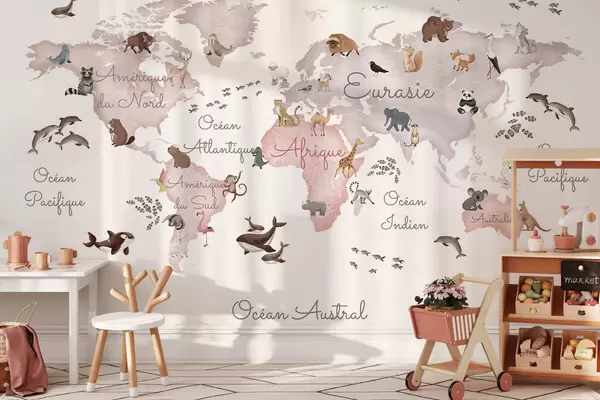 Τοιχογραφίες Ένας χάρτης σε μπεζ χρώμα, σε στυλ ακουαρέλας, με ζώα. Επιγραφές στα γαλλικά Nr. c00012frv3