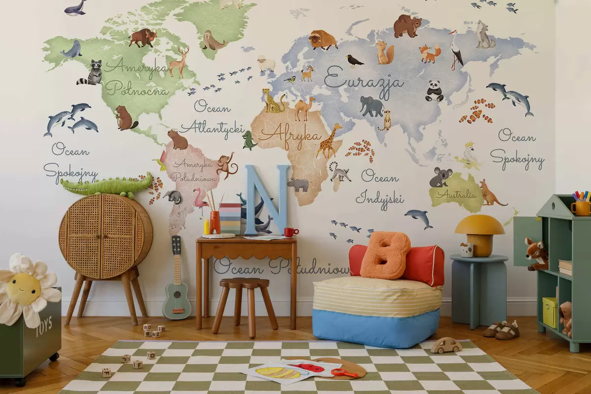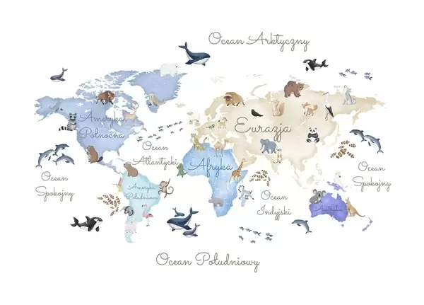 Τοιχογραφίες Ένας έγχρωμος χάρτης σε στυλ ακουαρέλας με ζώα. Επιγραφές στα πολωνικά Nr. c00012pl