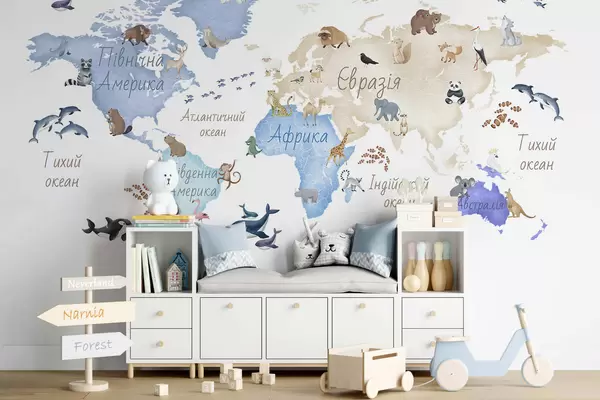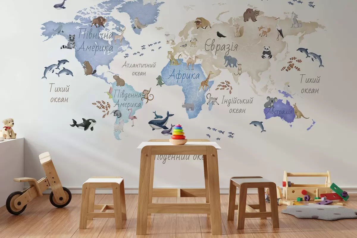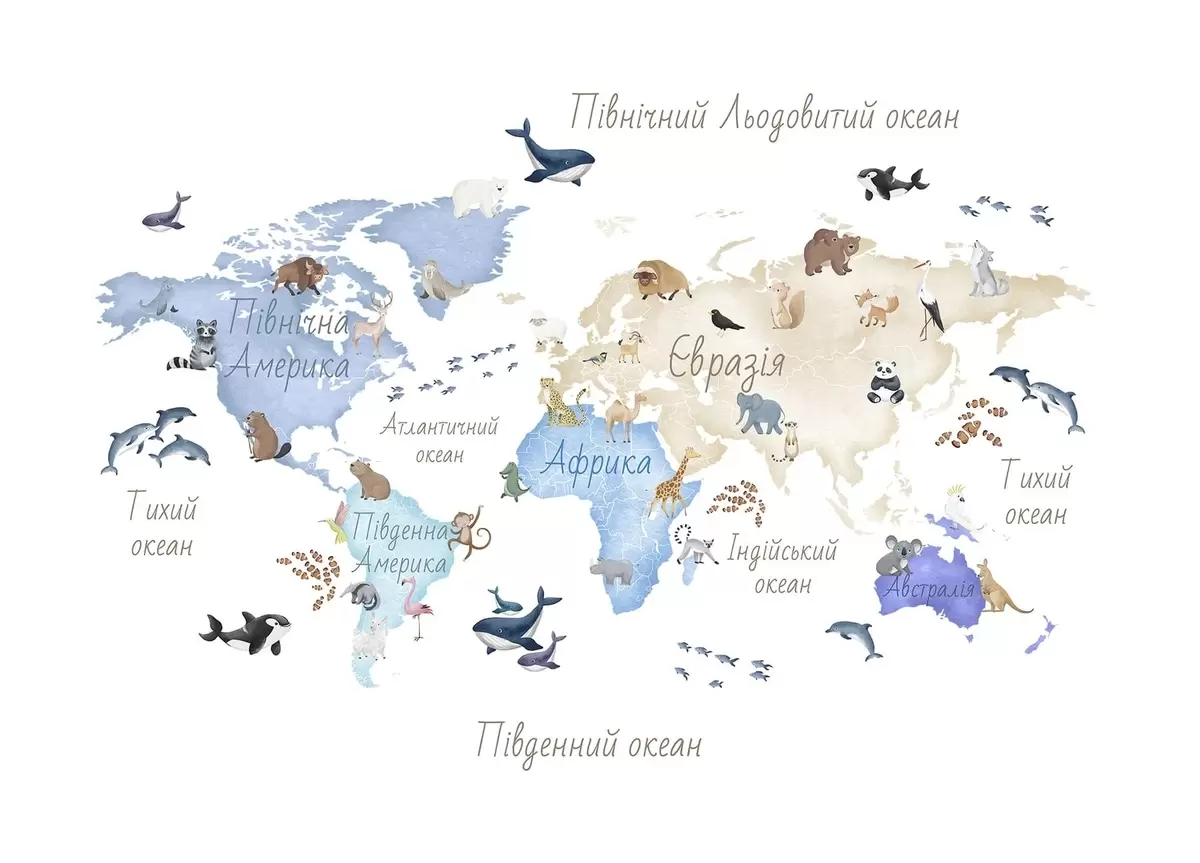 Τοιχογραφίες Ένας μπλε χάρτης σε στυλ ακουαρέλας με ζώα. Επιγραφές στα ουκρανικά Nr. c00012ukv1