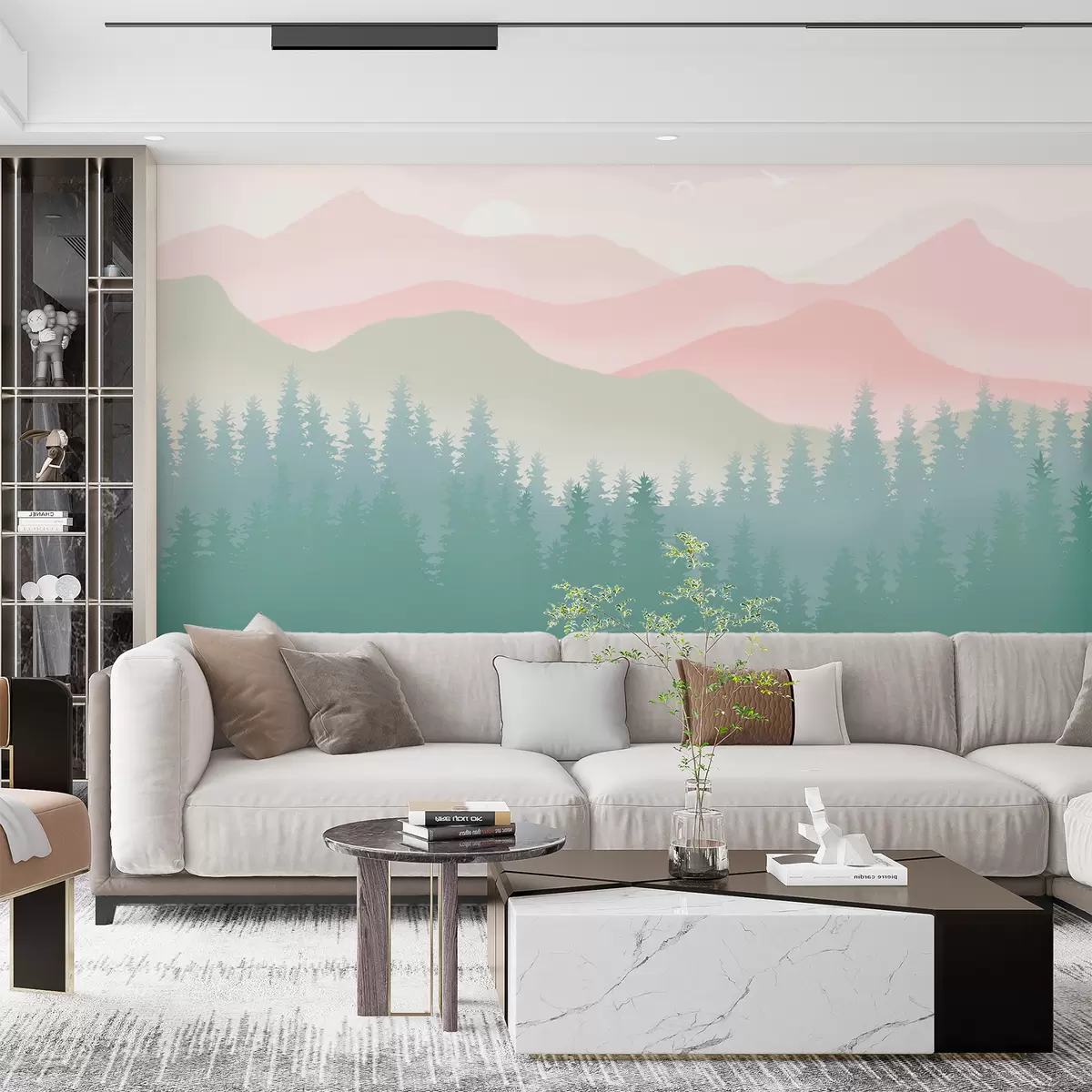Τοιχογραφίες Ομιχλώδη βουνά με πευκοδάσος, Μαλακά φυσικά χρώματα, ροζ και πράσινο Nr. u98774