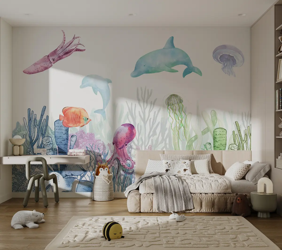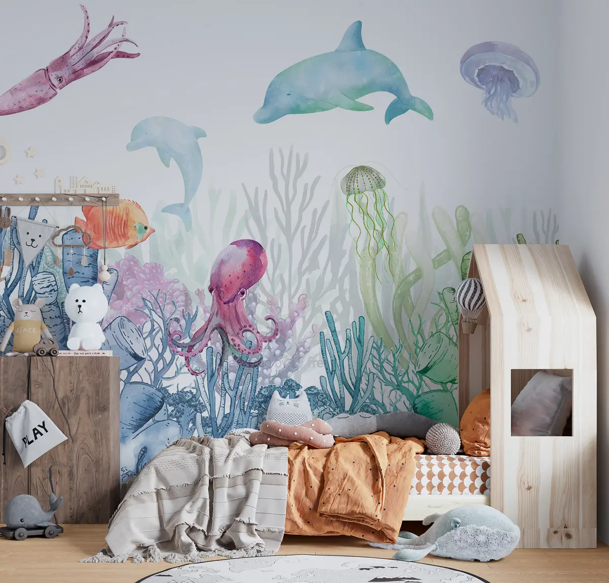 Τοιχογραφίες Υποβρύχια θαλάσσια ζωή, θαλάσσια ζώα, ακουαρέλα, κοράλλια, δελφίνι, χταπόδι Nr. u98899