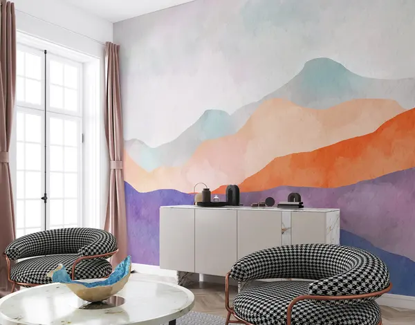 Τοιχογραφίες Βουνά τοπίο, αφηρημένο σχέδιο, boho στυλ, πορτοκαλί, μαργαρίτα, μπλε Nr. u98991