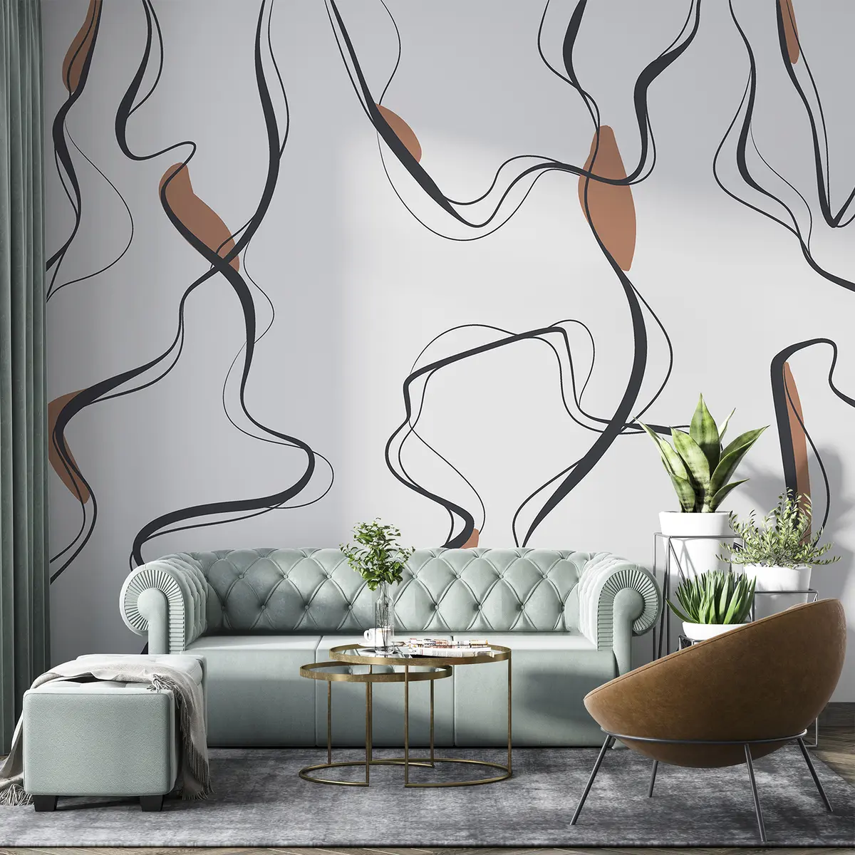 Τοιχογραφίες Μελάνι σχέδιο τέχνης, αφηρημένο μοτίβο, γεωμετρικές γραμμές, γκρι και πορτοκαλί Nr. u99659v3