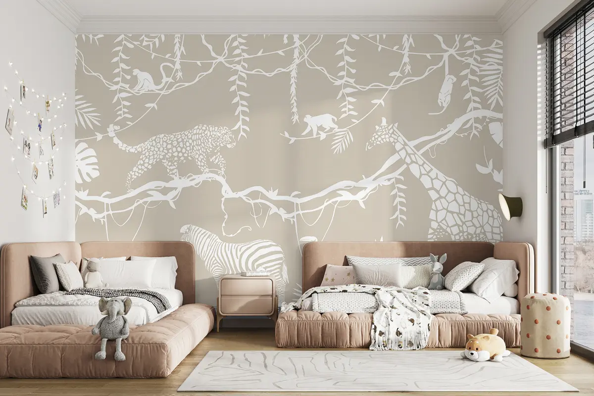 Τοιχογραφίες Αφηρημένη τέχνη ζούγκλας, λιάνες, λεοπάρδαλη, καμηλοπάρδαλη, πίθηκοι, φοίνικες, monstera, μπεζ και λευκό Nr. w00087