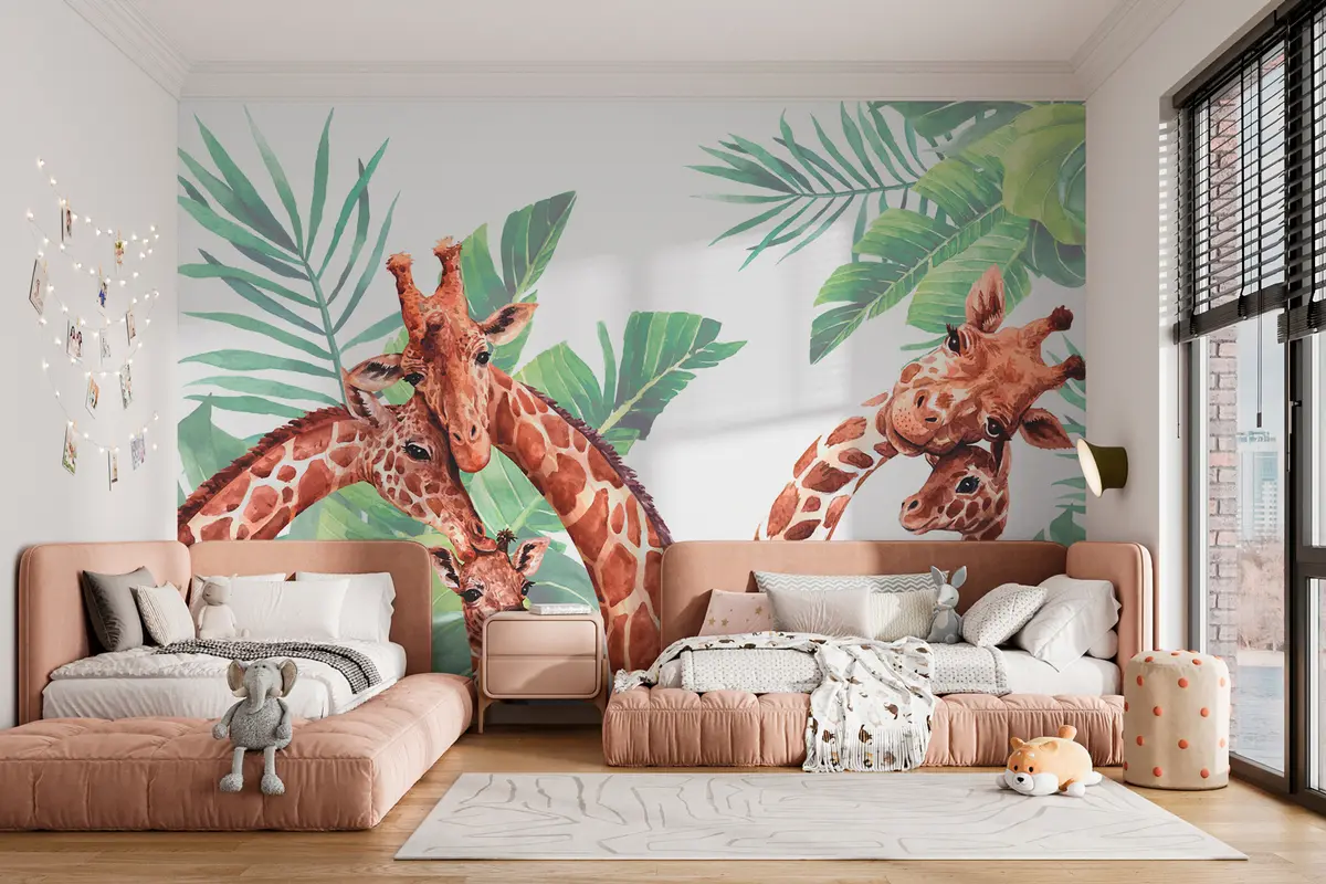 Τοιχογραφίες Καρτούν καμηλοπάρδαλη οικογένεια και φύλλα φοίνικα σε λευκό φόντο Nr. w00140v3